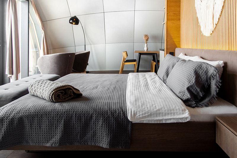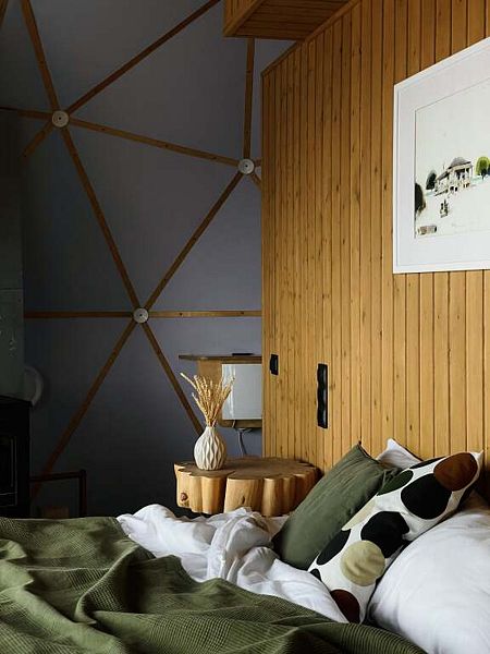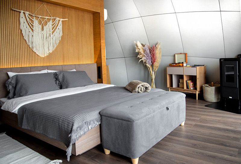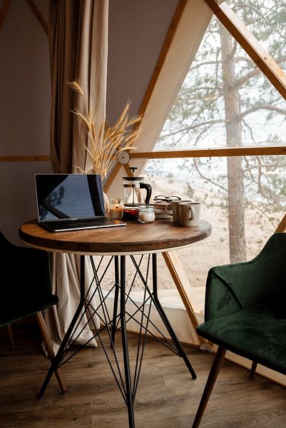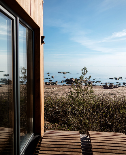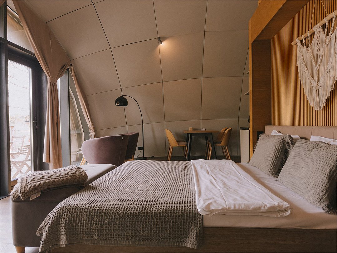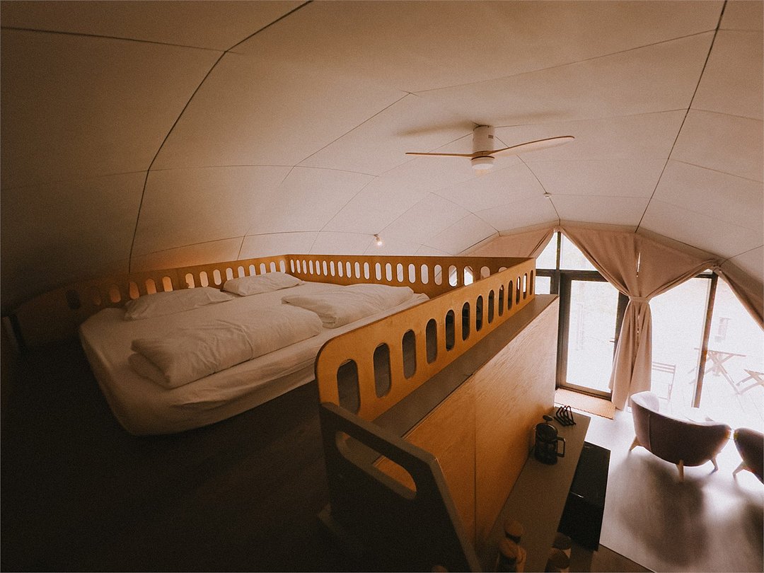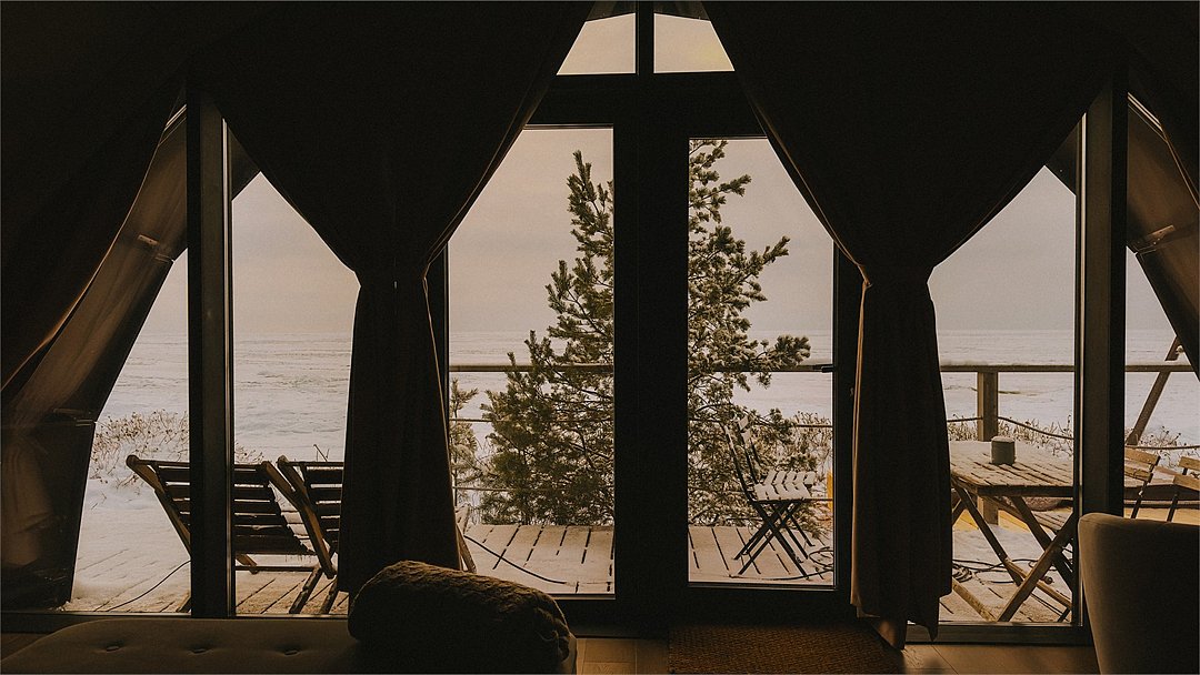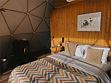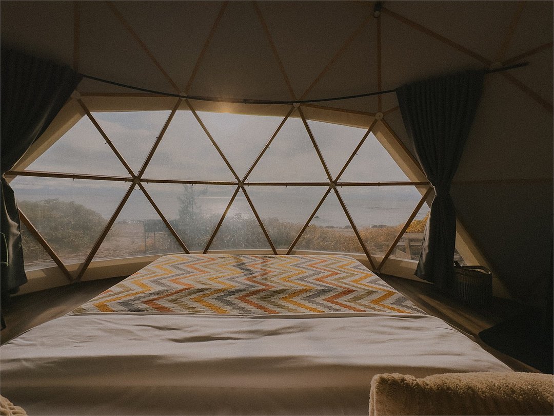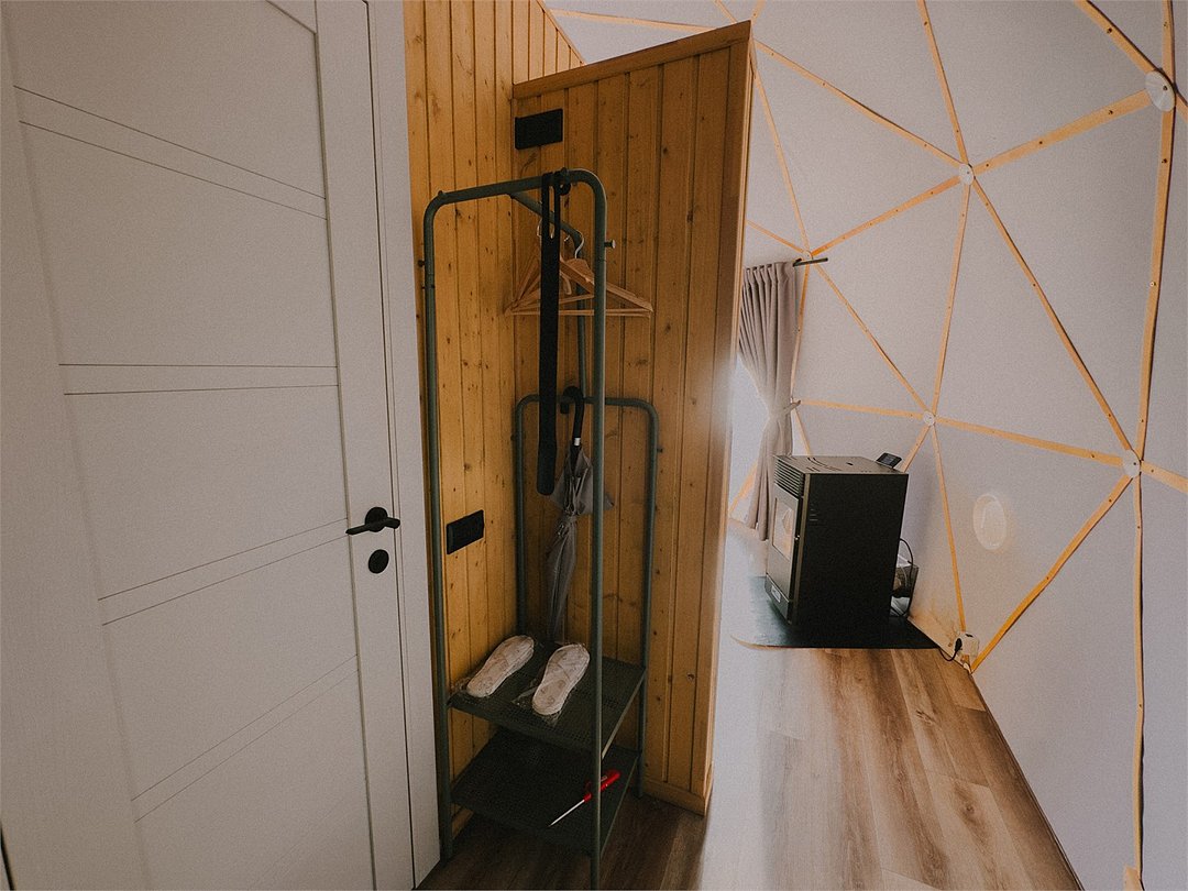 Купол с панорамным окном и видом на Финский залив или сосновый лес. Купола первой линии расположены на границе леса и пляжа, до воды около 50 метров. Купола второй линии чуть дальше от залива в лесу и вид из окна открывается на окружающую территорию. Внутри теплые полы и дровяная печь для комфортного отдыха даже в холодное время года.