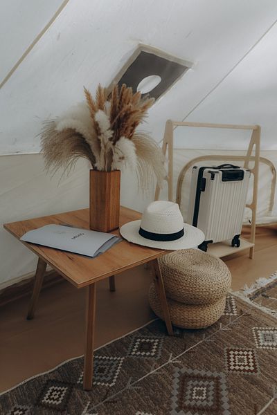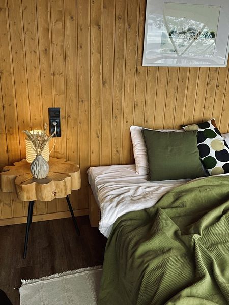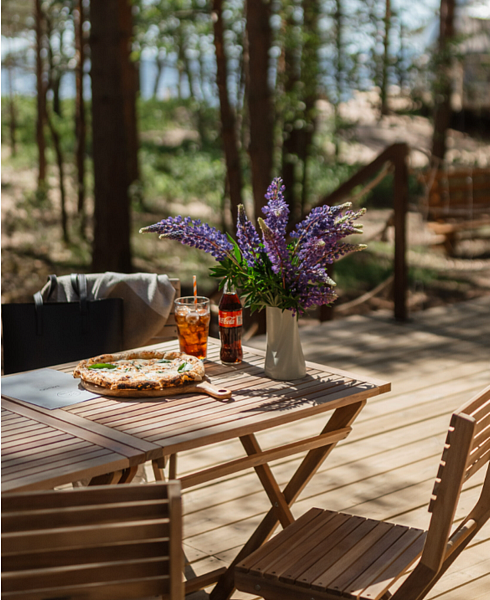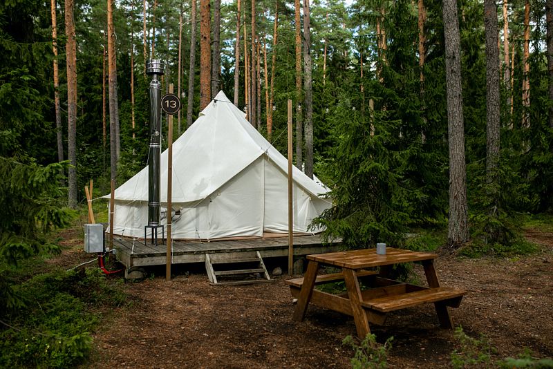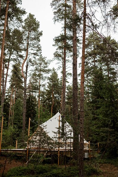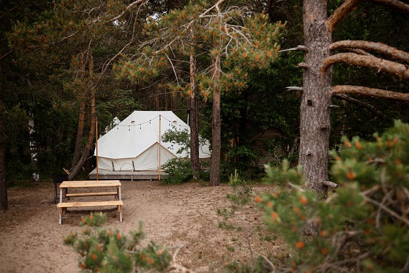 Шатёр для двоих или троих человек в сосновом лесу в трех минутах от Финского залива. Индивидуальные удобства расположены у каждого шатра. В шатре есть электричество и розетки, двуспальная кровать и дополнительное кресло, столик, чайник, холодильник и посуда, есть запас питьевой воды. Мангальная зона и столик расположены около шатра.