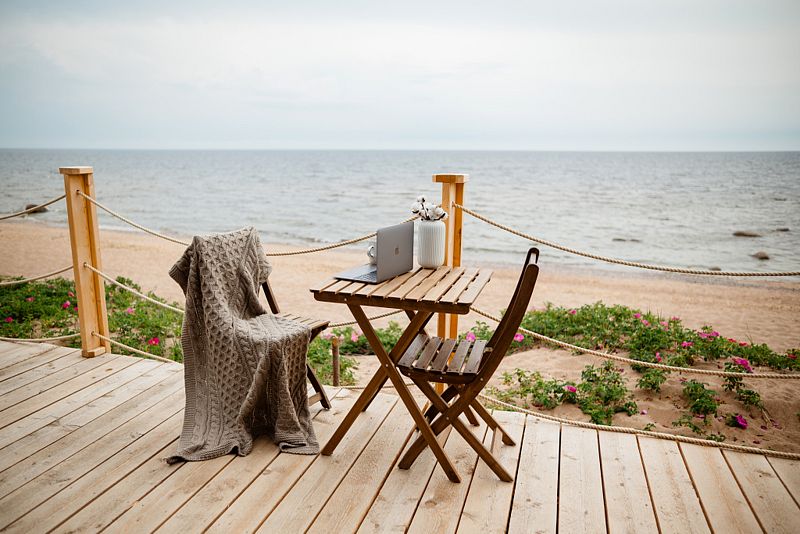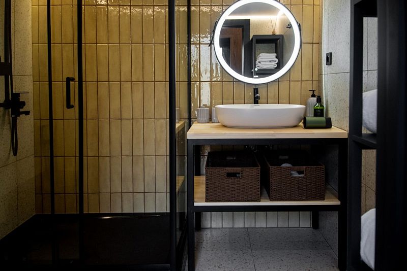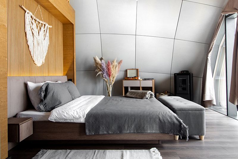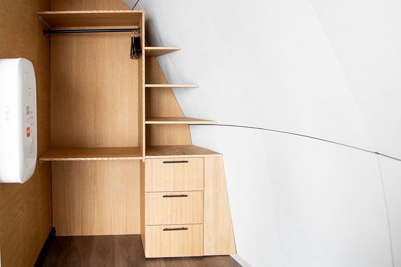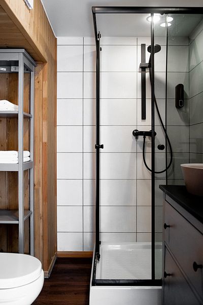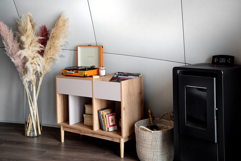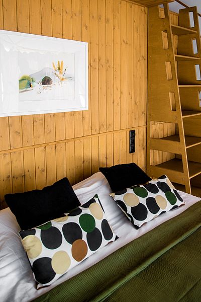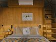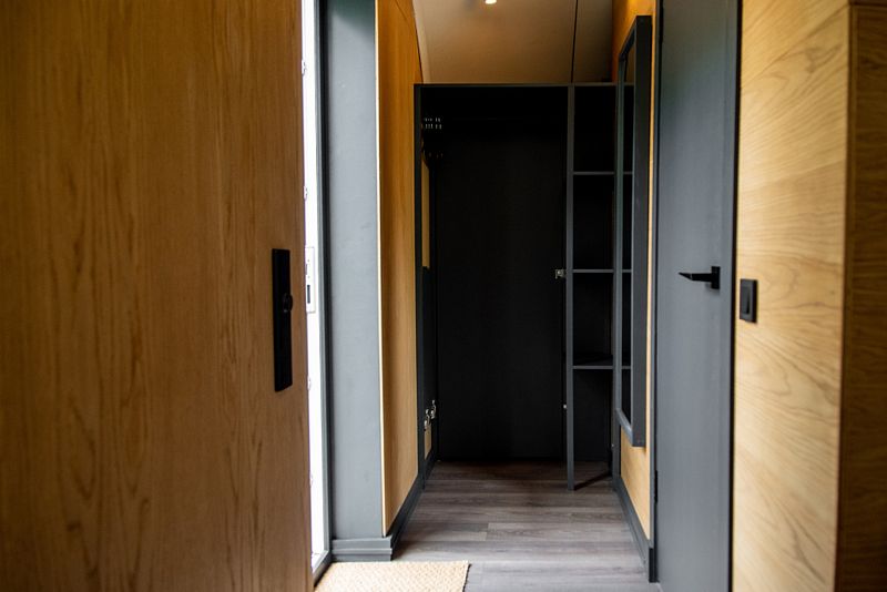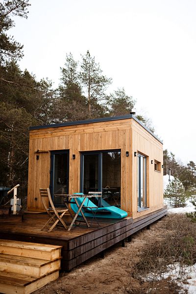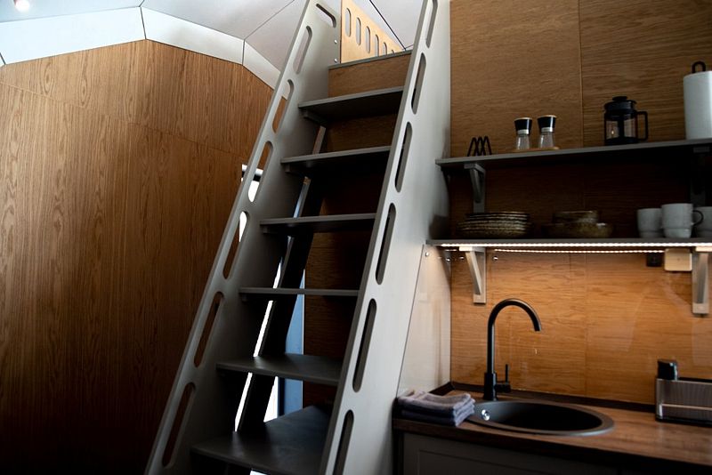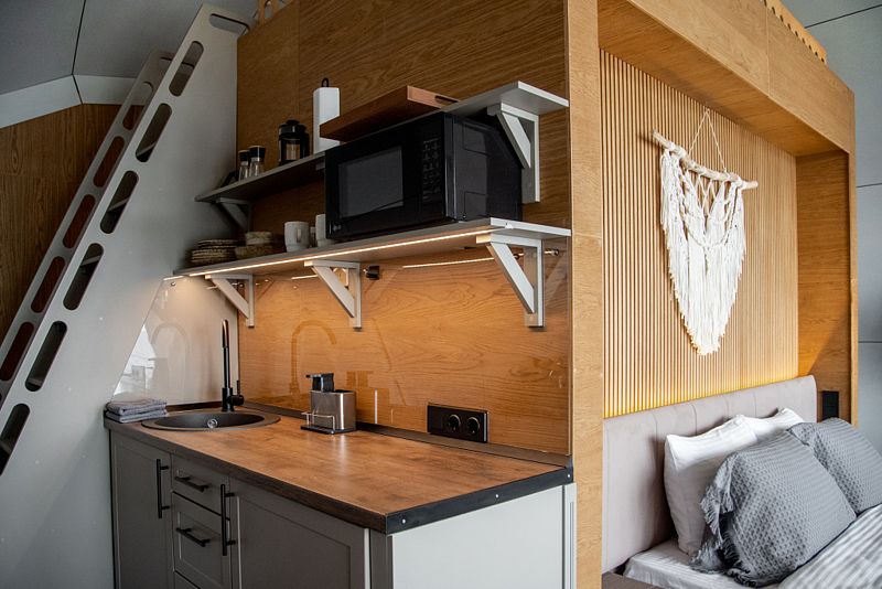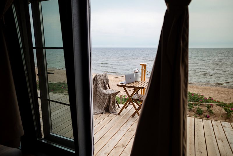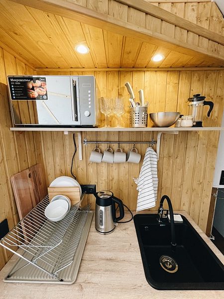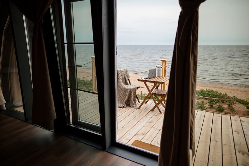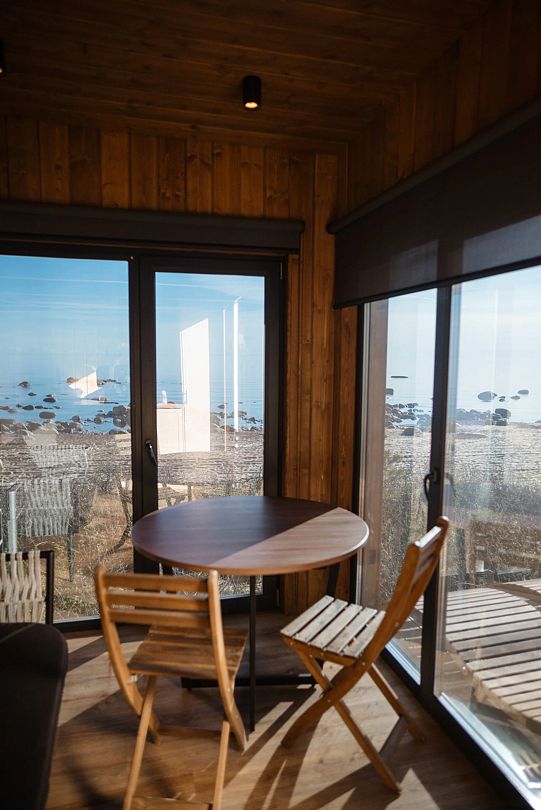 В доме панорамное остекление с видом на залив, собственная терраса. В доме есть современный санузел, две двуспальных кровати, кухня с холодильником и микроволновой печью, чайная/кофейная станции, зона отдыха, виниловый проигрыватель.