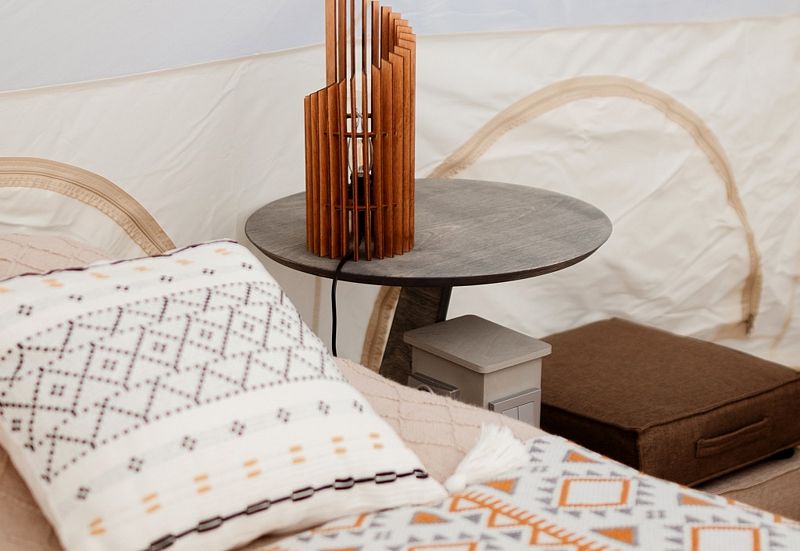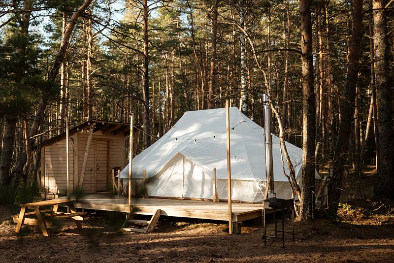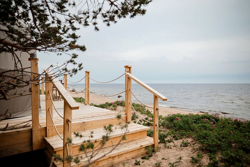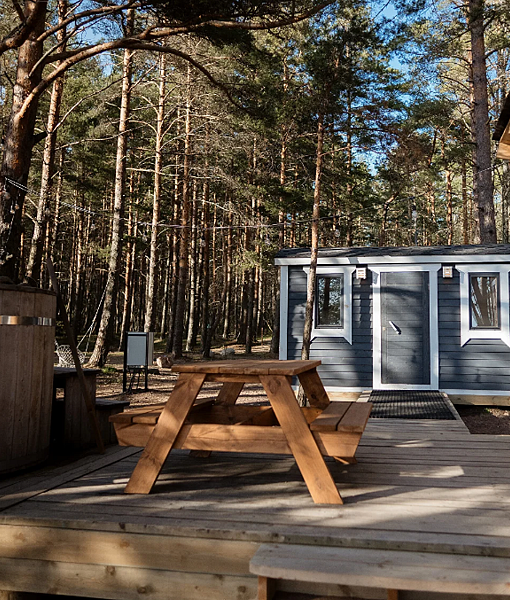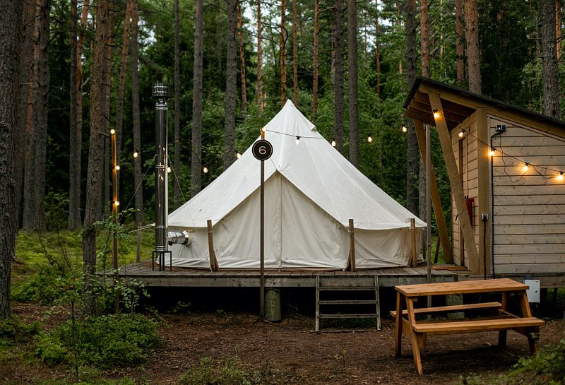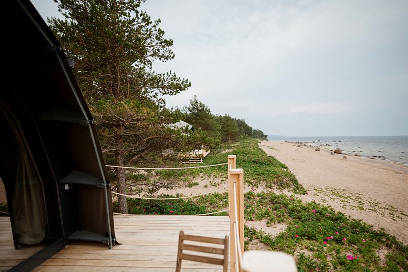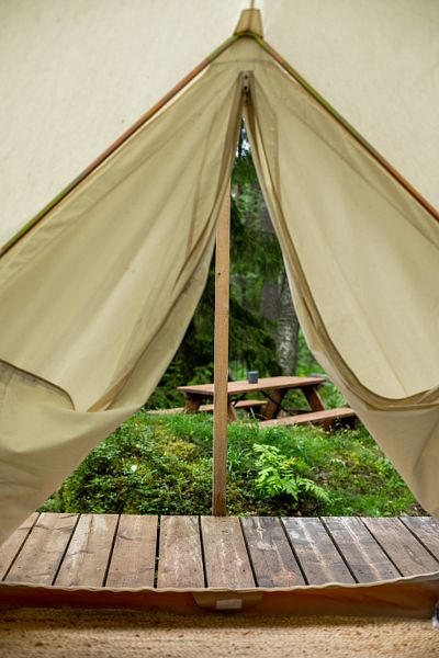 Большие семейные шатры для четверых гостей, расположенный в сосновом лесу на берегу Финского залива. Индивидуальные удобства расположены у каждого шатра. В шатре есть электричество и розетки, двуспальная кровать и двуспальный диван, столик, чайник, холодильник и посуда, есть запас питьевой воды. Мангальная зона и столик расположены около шатра.