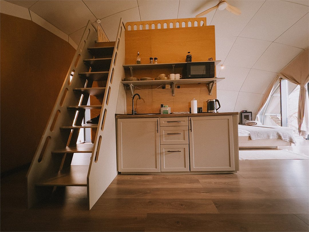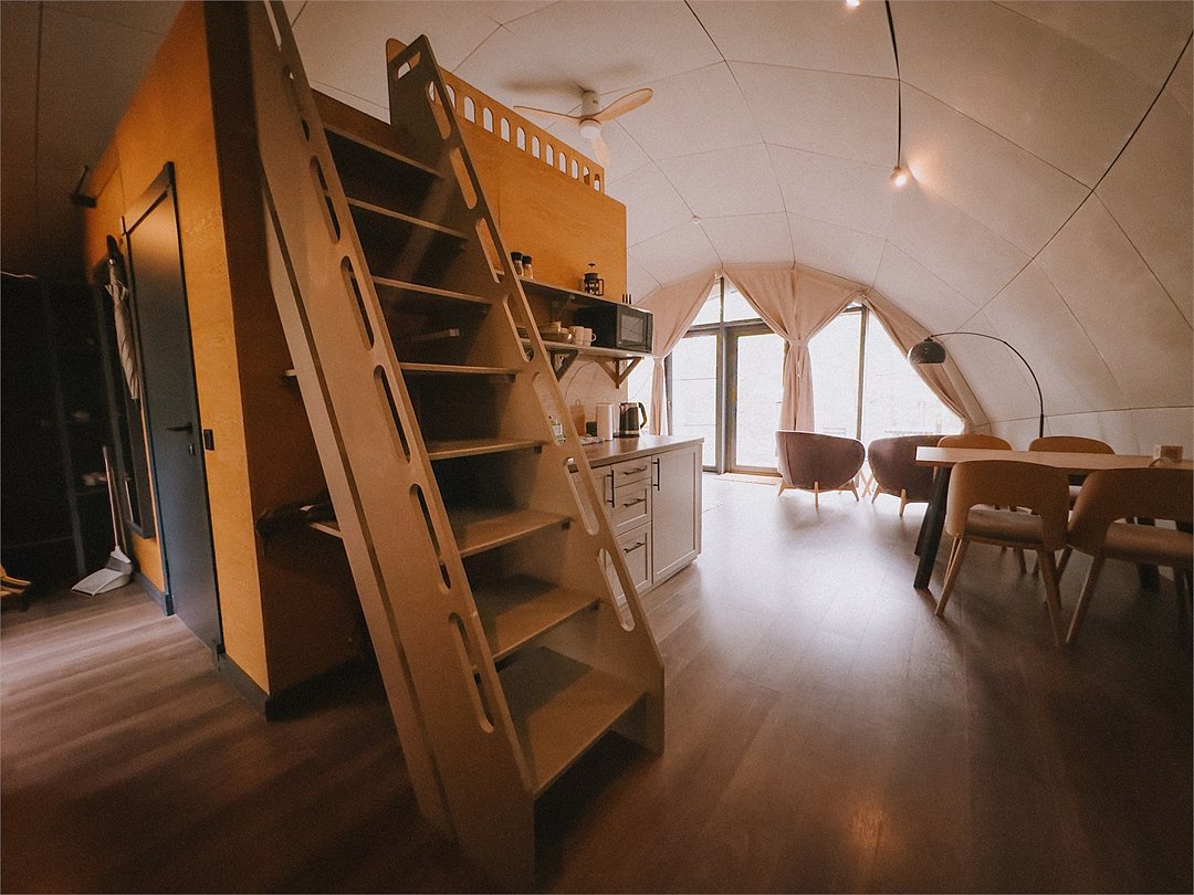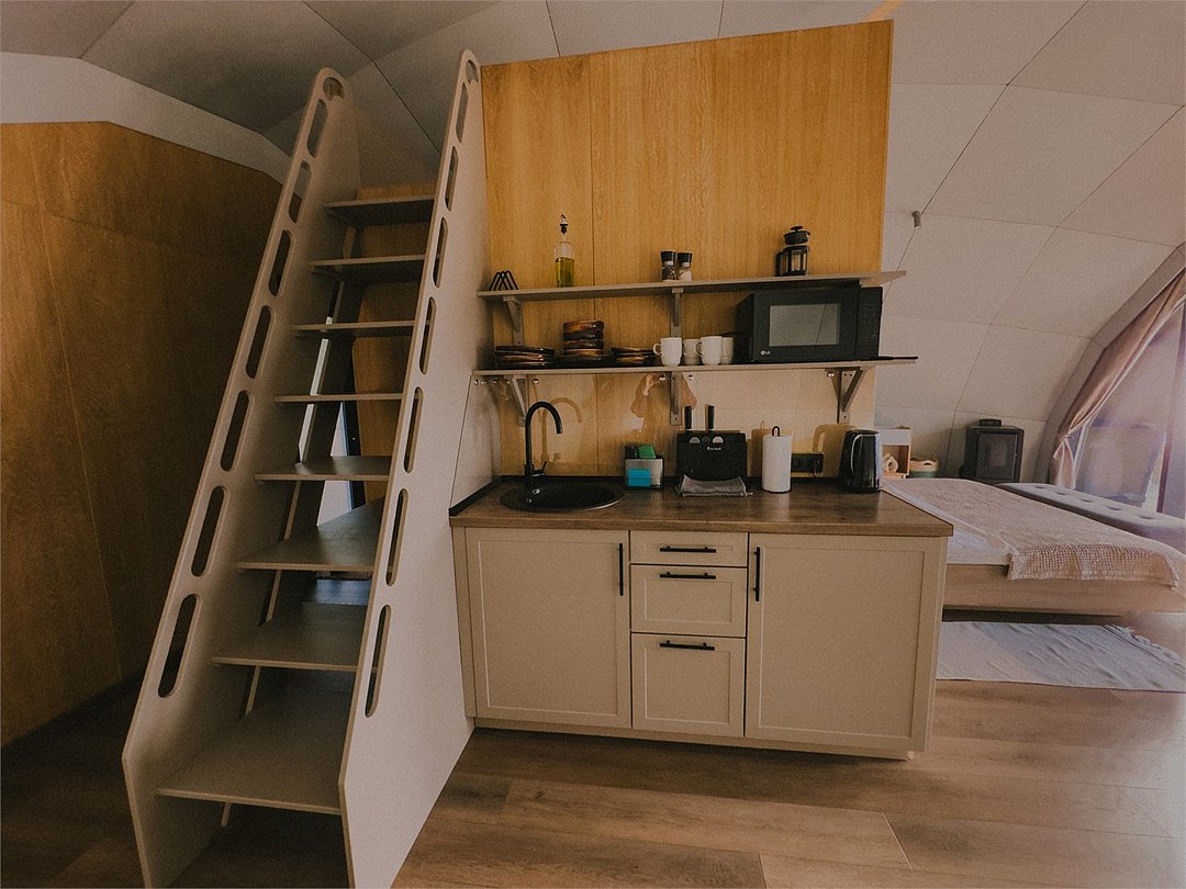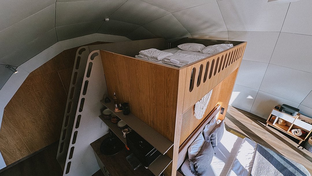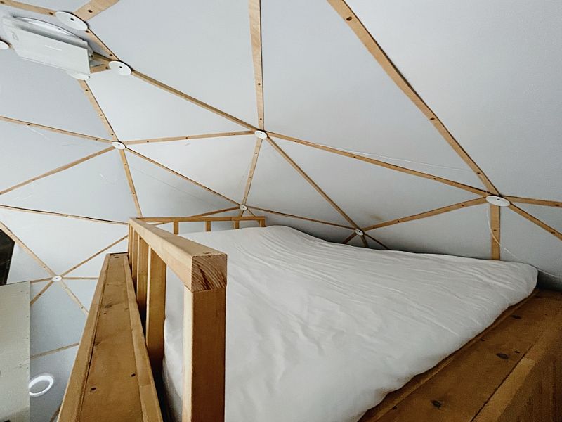 Купол с панорамным окном и видом на Финский залив. Площадь купола 28 квадратных метров, максимальное количество гостей 4 человека. Внутри есть все необходимое для комфортного отдыха: – двуспальная кровать на первом этаже и еще одна двуспальная на втором уровне – мини-кухня с микроволновой печью, холодильником и чайником – посуда и столовые приборы на 4 человек – электрообогрев, вентиляция и кондиционер – пилетная печь – стол и стулья – санузел с душевой кабиной, раковиной, туалетом. – постельное белье, полотенца – снаружи купола индивидуальный мангал и стол с лавками В этот купол нельзя заехать с домашним питомцем. В куполе отсутствует сотовая связь, есть WiFi.Услуги и удобства