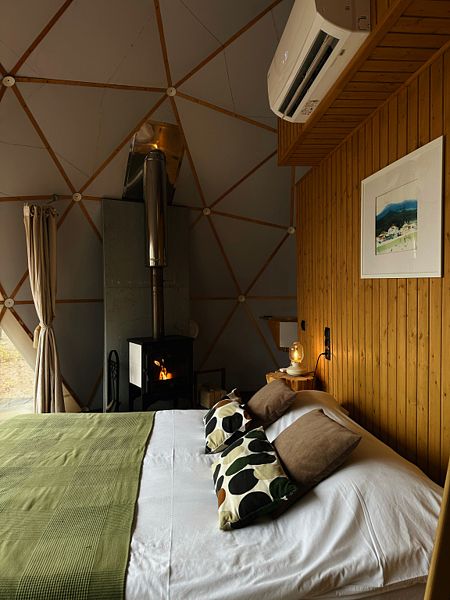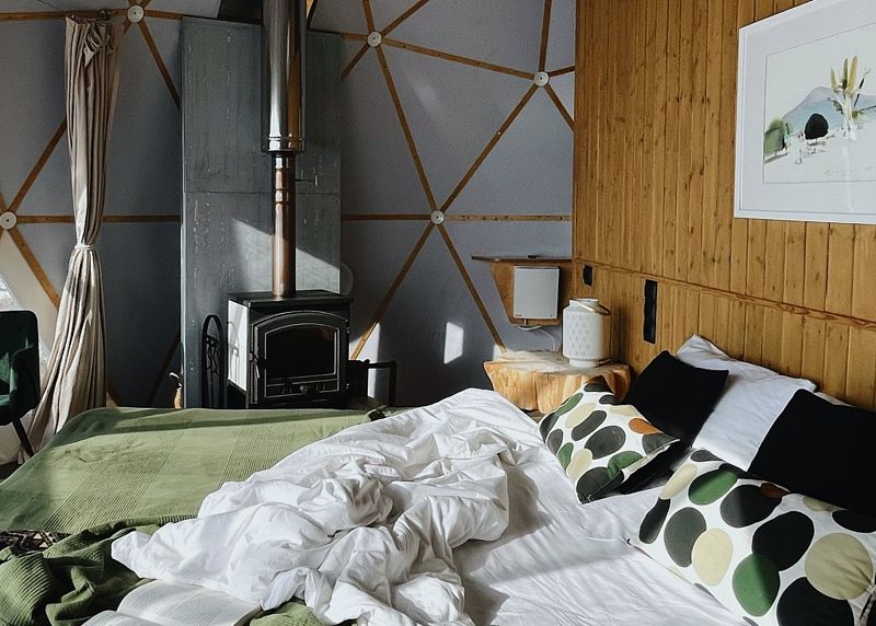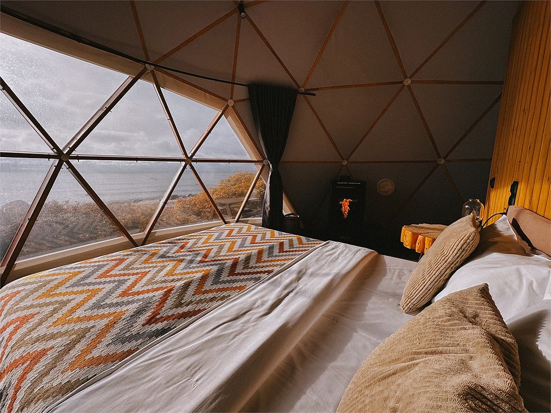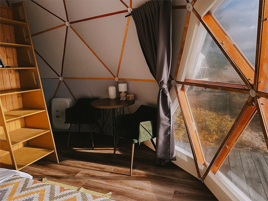 Wi-Fi, кондиционер, настольные лампы, кулер, фен, микроволновая печь, санузел, банные принадлежности, халаты, банные полотенца, тапочки, гигиенические средства, косметические средства, терраса, две двуспальные кровати, стулья, шкаф для одежды, вешалки, зеркало, камин, набор посуды, обслуживание номеров, чайник, унитаз, раковина, питьевая вода, отопление, отдельный вход в номер, душ, высокие потолки, кухонная посуда, стол, мангал, панорамные окна, мини-холодильник, кухонный уголок, вид на залив, уборка номера, без питомцев, уличная мебельВ купольном шатре