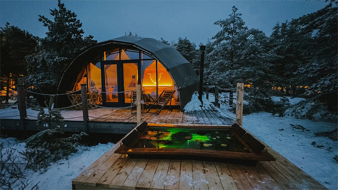 музыкальный центр, Wi-Fi, кондиционер, настольные лампы, фен, санузел, банные принадлежности, халаты, банные полотенца, тапочки, гигиенические средства, косметические средства, терраса, две двуспальные кровати, кресла, тумбы, стулья, шкаф для одежды, вешалки, журнальный столик, обеденный стол, зеркало, комод, камин, набор посуды, обслуживание номеров, чайник, унитаз, раковина, питьевая вода, обеденная зона, гостиная зона, отопление, душ, высокие потолки, кухонная посуда, стаканы, столовые приборы, мангал, панорамные окна, мини-холодильник, кухонный уголок, вид на залив, умная колонка, уборка номера, веранда, затемняющая штора, окна от пола до потолка, можно с питомцами, миска, пакетик для выгула, уличная мебель, купельВ купольном шатре