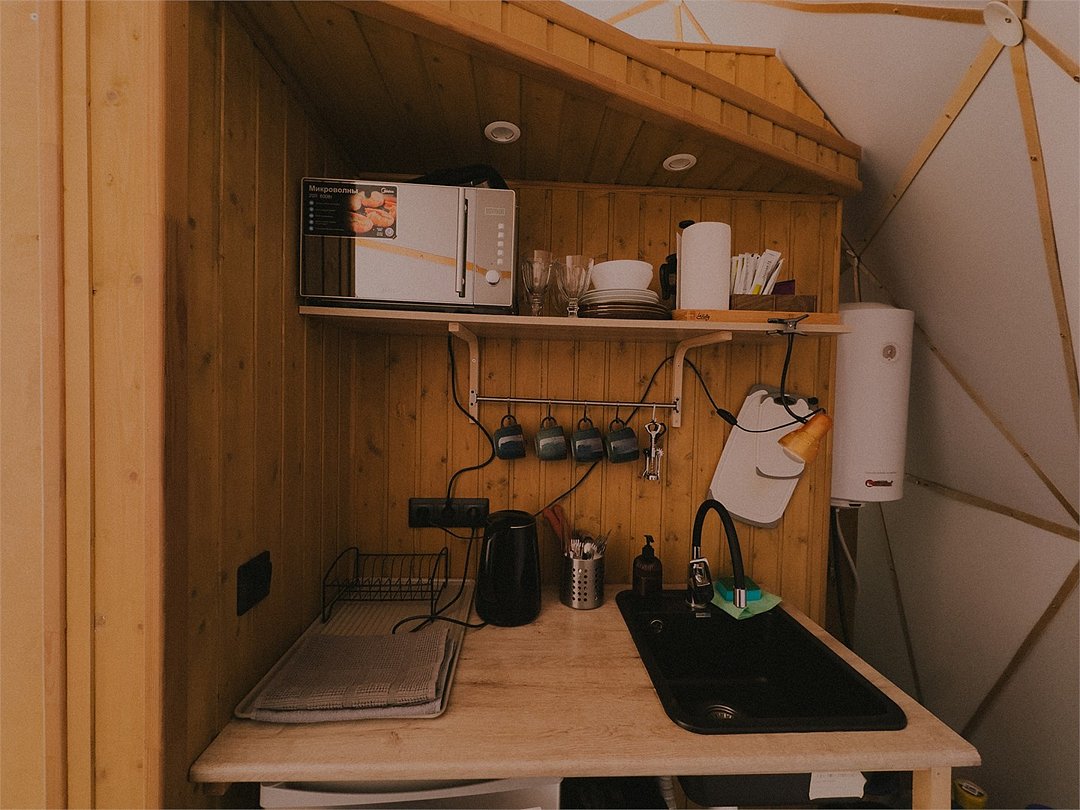 Wi-Fi, кондиционер, настольные лампы, кулер, фен, микроволновая печь, санузел, банные принадлежности, халаты, банные полотенца, тапочки, гигиенические средства, косметические средства, терраса, две двуспальные кровати, стулья, шкаф для одежды, вешалки, зеркало, камин, набор посуды, обслуживание номеров, чайник, унитаз, раковина, питьевая вода, отопление, отдельный вход в номер, душ, высокие потолки, кухонная посуда, стол, мангал, панорамные окна, мини-холодильник, кухонный уголок, вид на лес, уборка номера, можно с питомцами, миска, пакетик для выгула, уличная мебельВ купольном шатре