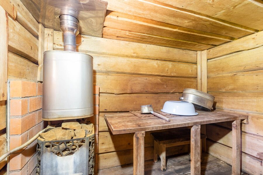 2-х ярусная кровать на 4 чел., с/у, кухня, дровяная печь. Уличная баня с моечной. Моб.связь с перебоями.