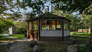На благоустроенном участке вы найдете все необходимое для активного отдыха: парковочные места, отдельно стоящую баню по-черному, зоны для приготовления барбекю и копчения, крытую беседку на 25 человек, тандыр и мангальную зону.