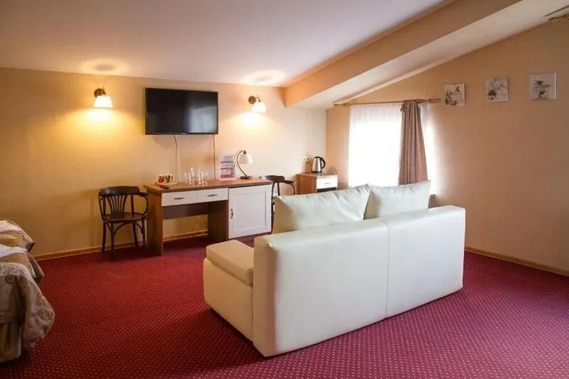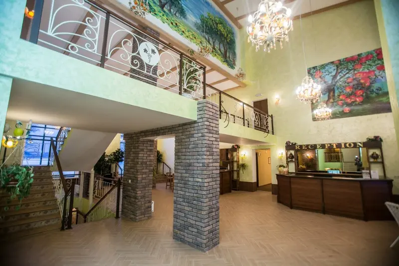 Интерьер отеля выполнен в стиле усадьбы-дачи прошлых лет: активно используется дерево разных видов, резные элементы, балки, светлые натуральные тона с включением цветочного орнамента, текстиль, стилизованная под старину мебель, певчие птицы в клетках и большое количество живых растений. Для маленьких гостей здесь тоже найдутся развлечения – собственный мини-зоопарк с добрыми домашними животными, которых можно покормить и погладить, детские площадки, батут, игровая зона рядом с рестораном, где малыши могут играть, оставаясь в поле зрения отдыхающих родителей.