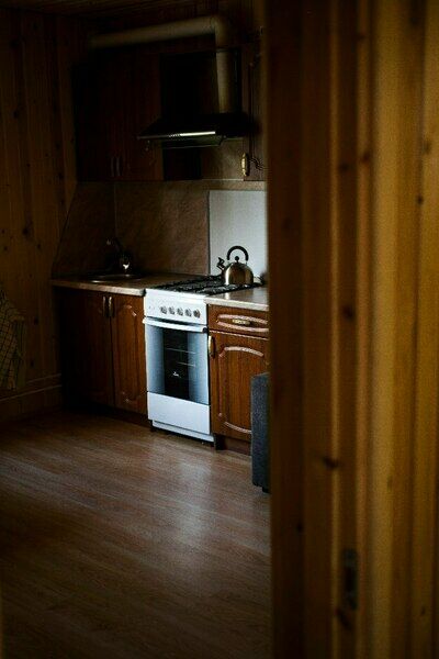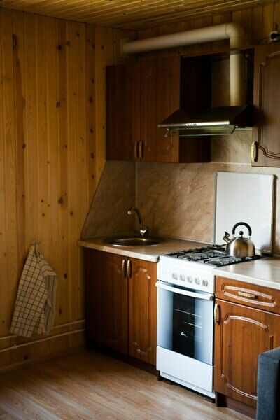 - кухня (холодильник, плита, кухонный гарнитур, обеденный стол)