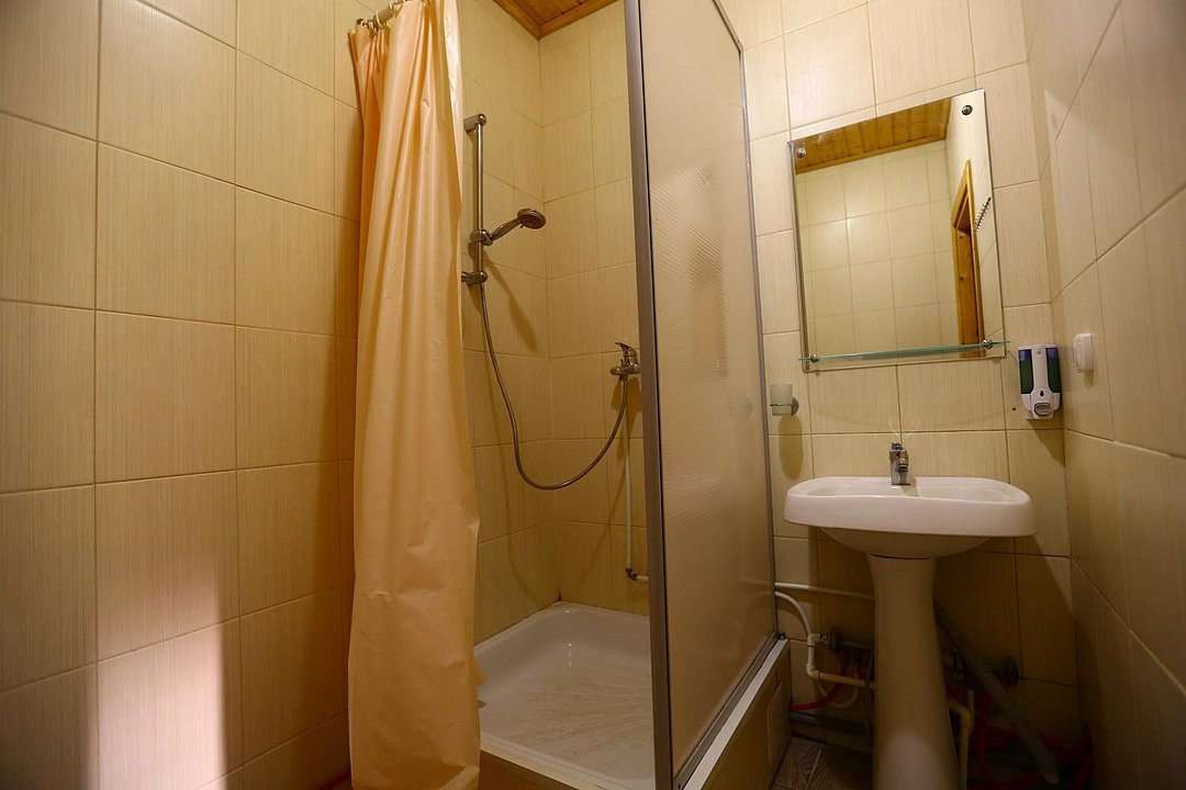 банные полотенца, двуспальная кровать, душ, туалетВ коттедже