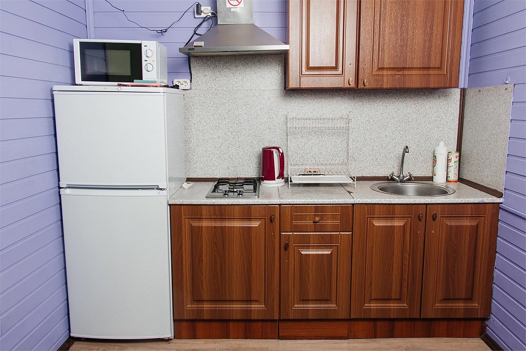 холодильник, плита для приготовления пищи, обеденный стол, чайник, душ, кухонная утварь, столовые приборы, стул, мангал, биотуалетВ гостиничном номере