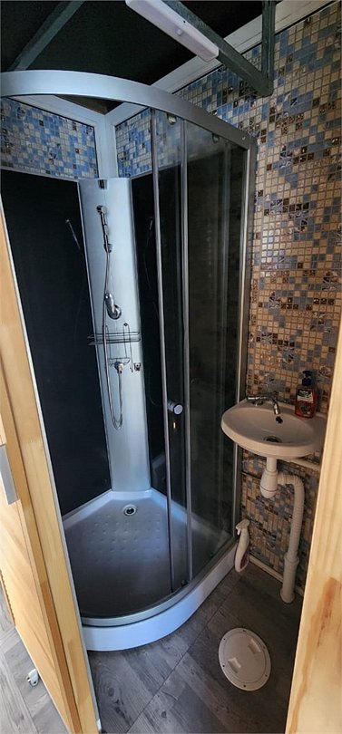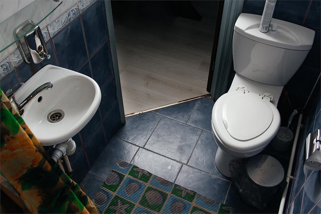 набор посуды, чайник, питьевая вода, душ, кухонная посуда, стаканы, столовые приборы, биотуалет, двуспальный раскладной диван-кроватьВ плавучем доме