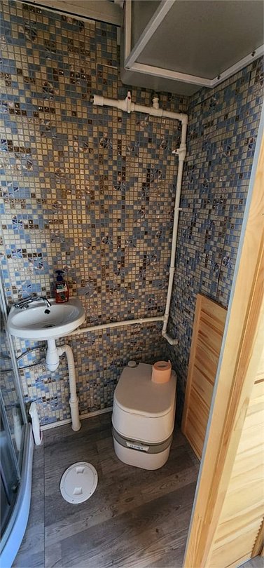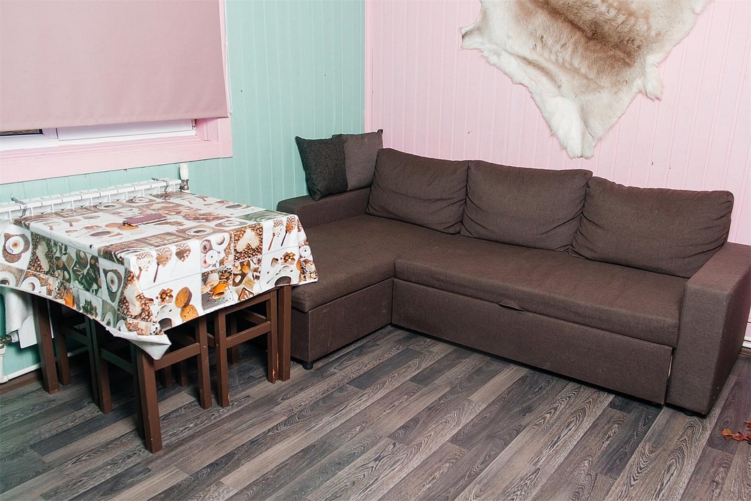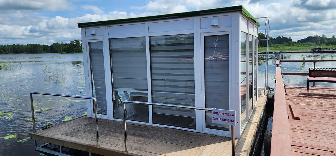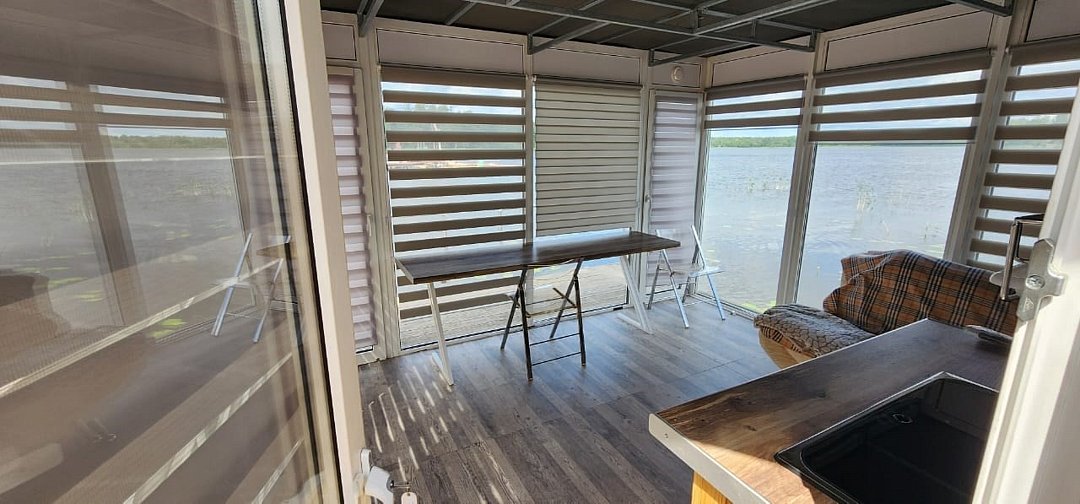 Дом на воде. Студия. Двуспальный разборный диван, биотуалет, душ, микроволновая печь, холодильник, чайник, посуда.Услуги и удобства