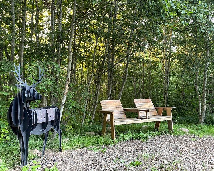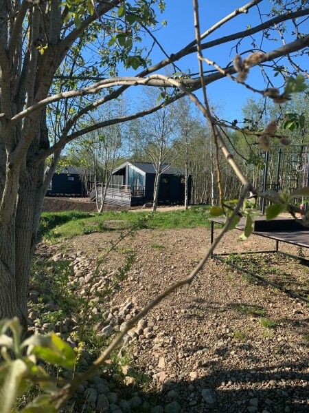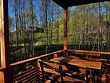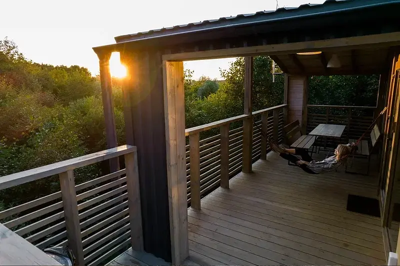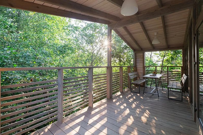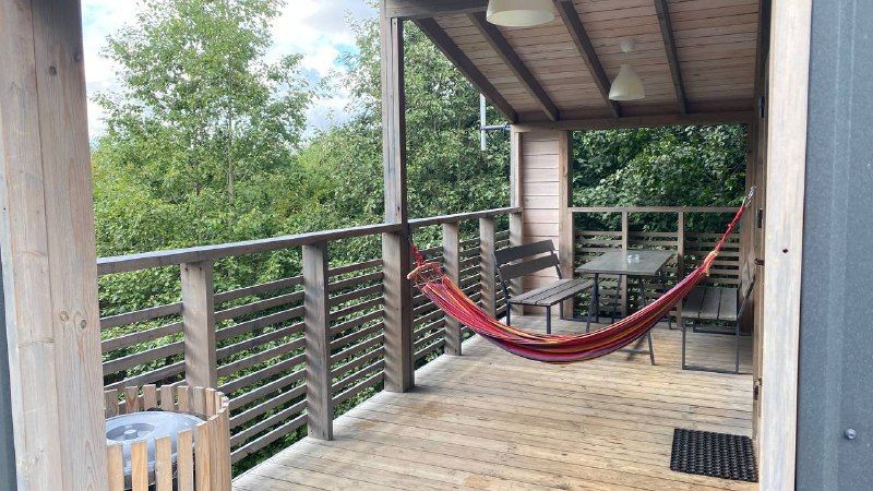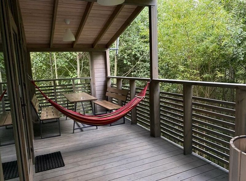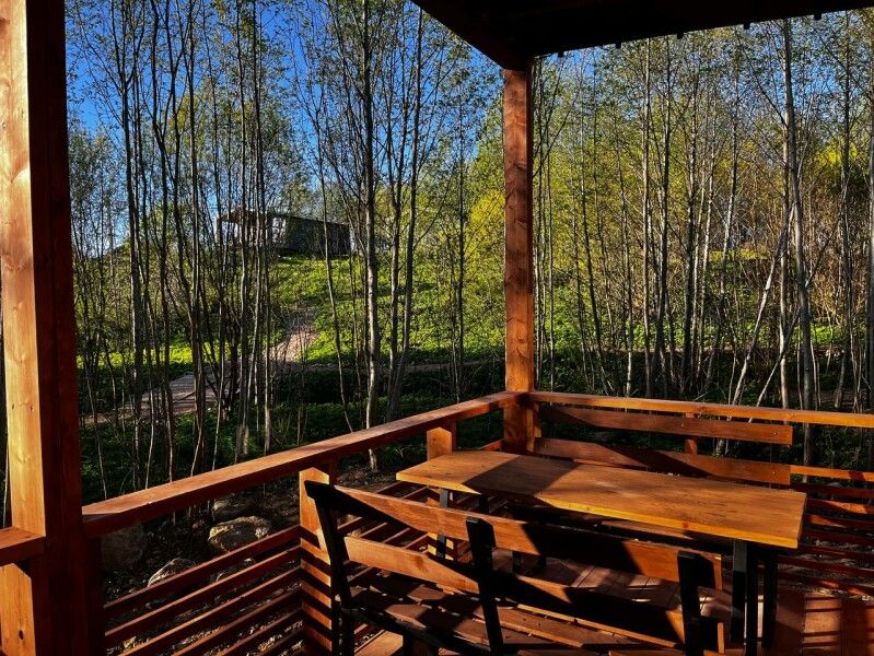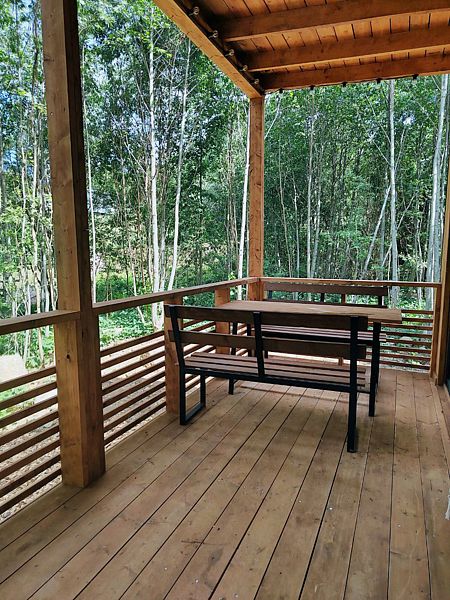 Терраса с панорамным видам в кронах молодых осин. Терраса площадью 15 кв.м оборудована деревянным столом и скамейками со спинкой, гамаком, розетками и освещением по периметру и зонам.