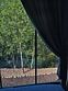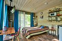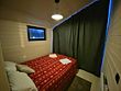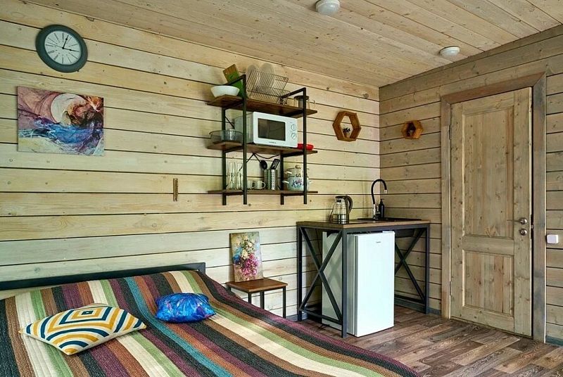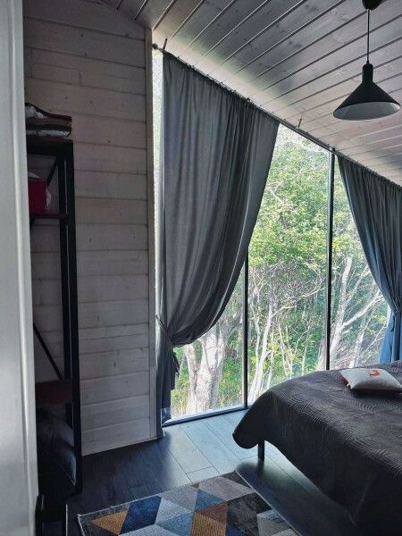 Коттедж имеет 1 изолированную спальную комнату с панорамным остеклением. В спальне двуспальная кровать, стеллаж для одежды, ночная лампа, шторы блэкаут.