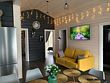 В каждой спальне двуспальная кровать, стеллаж для одежды, ночная лампа, шторы блэкаут и телевизор. Большая кухня-гостиная с панорамным видом на террасу и удобным кухонным модулем, включающем в себя: варочную панель, вытяжку, микроволновую печь, посудомоечную машину, чайник, большой холодильник, раковину, посуду для приема и приготовления пищи на 10 гостей. В гостиной зоне расположены 2 раскладных двуспальных дивана, обеденный стол и стулья, плазменный телевизор.