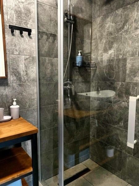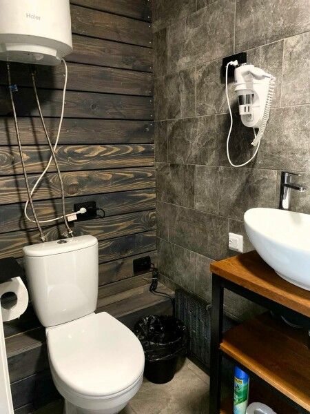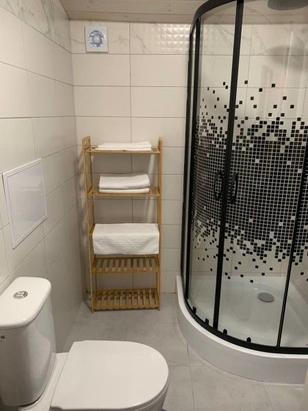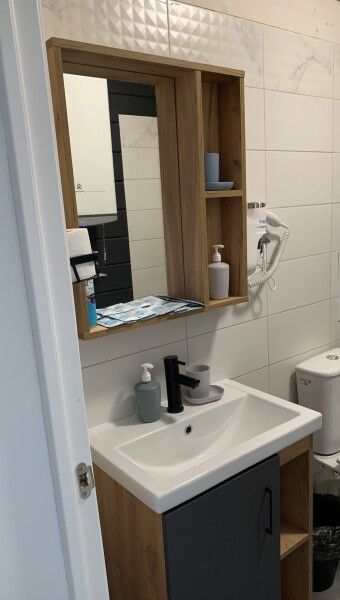 Небольшой санузел, в котором уместилось все необходимое: ванная/душевая кабина, унитаз, раковина на тумбе с зеркалом, теплый пол, фен, гигиенические принадлежности (крем-мыло для рук в дозаторе, гель-шампунь в дозаторе, туалетная бумага, тапочки, полотенца). Каждому гостю предоставляется 2 полотенца.