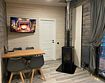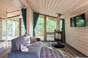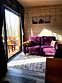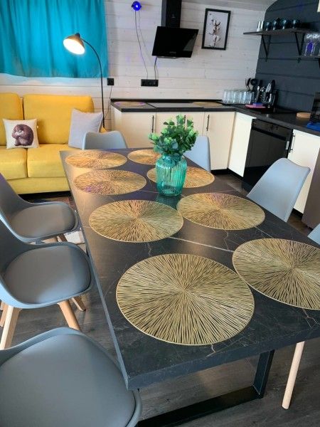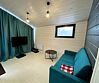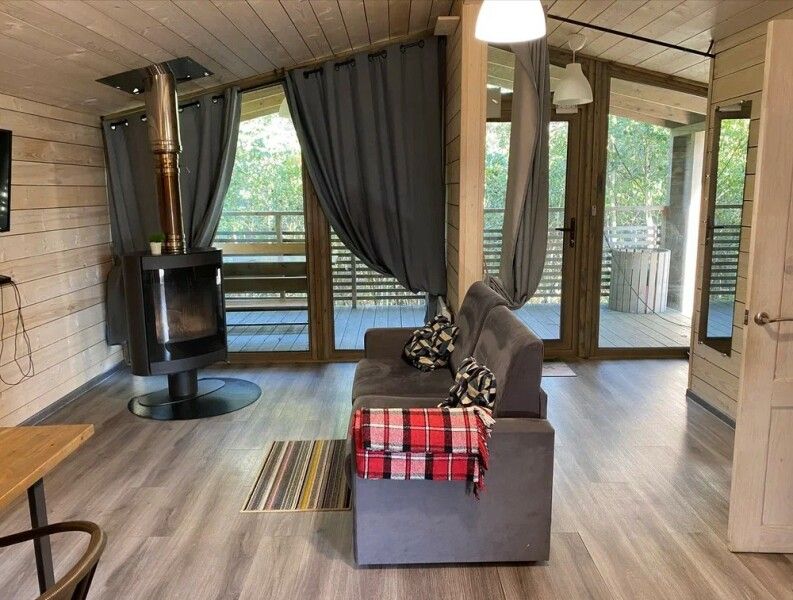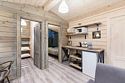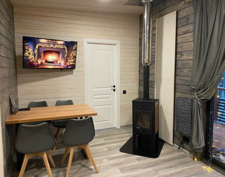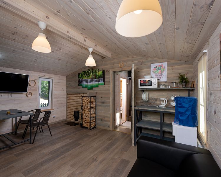 Просторная студия 20 кв.м с панорамным видом на террасу и удобным кухонным модулем включающий в себя: варочную панель, микроволновую печь, чайник, холодильник на 93л, раковину и посуду для приема и приготовления пищи на 2 гостя. В гостиной зоне расположен обеденный стол и стулья, камин, плазменный телевизор.