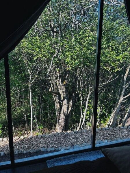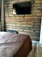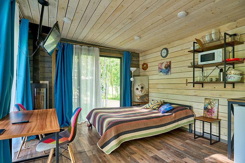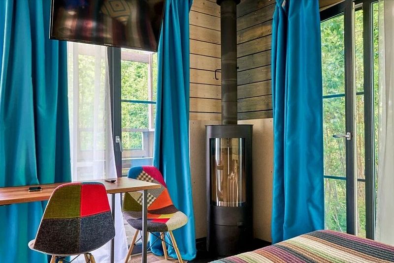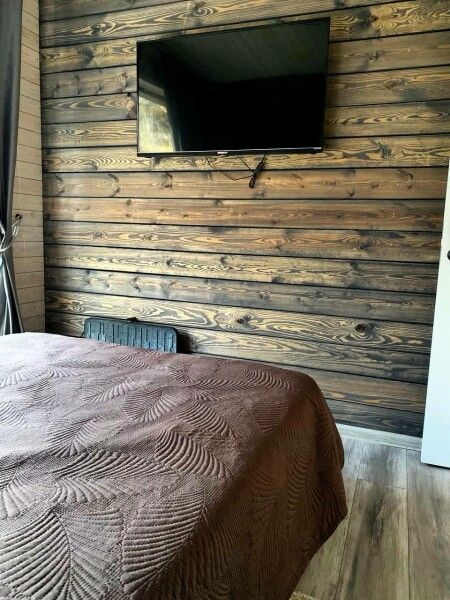 Коттедж имеет 1 изолированную спальную комнату с панорамным остеклением. В спальне двуспальная кровать, стеллаж для одежды, ночная лампа, шторы блэкаут и телевизор.