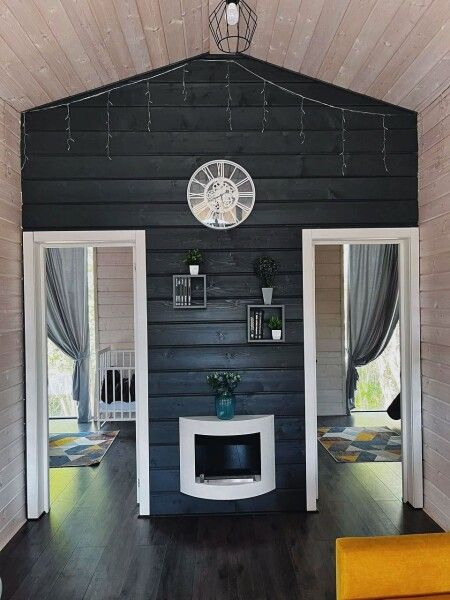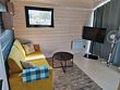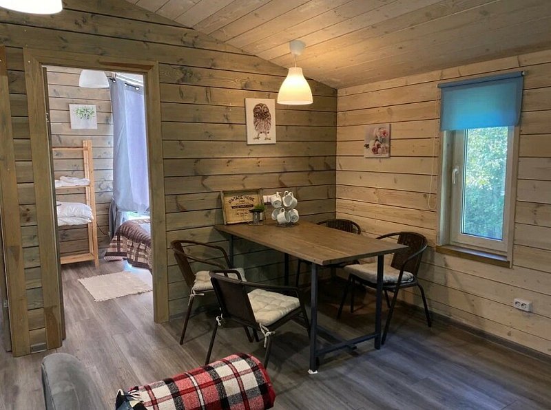 В гостиной зоне расположен раскладной диван, обеденный стол и стулья, камин, плазменный телевизор. Коттедж отапливается настенными конвекторами установленными в каждой зоне дома.