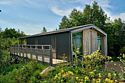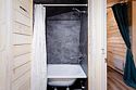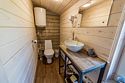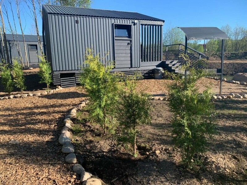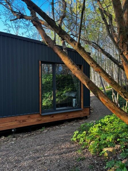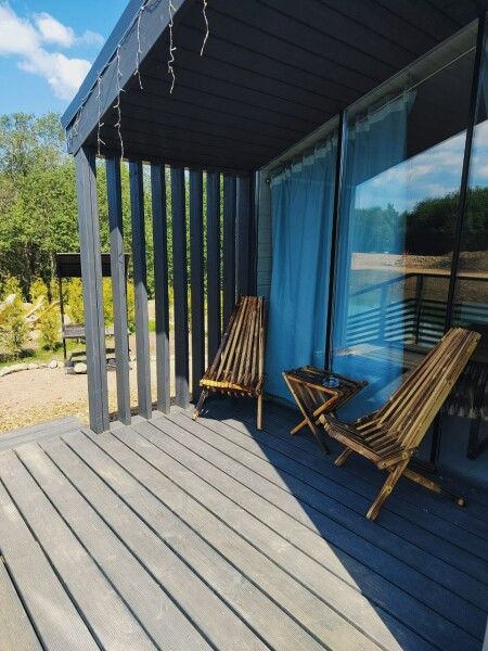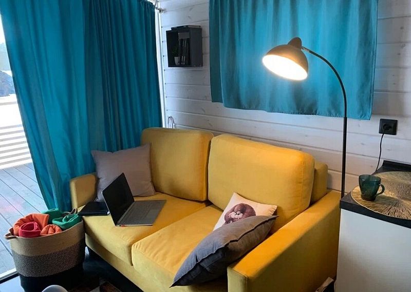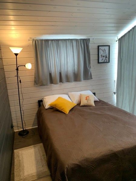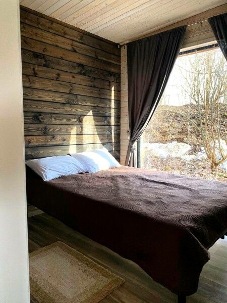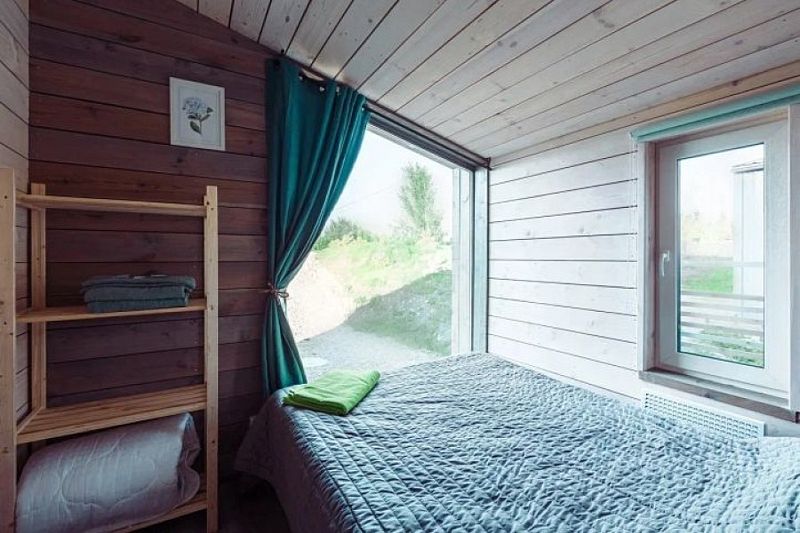Дом имеет 2 изолированные спальни с панорамными окнами площадью по 9 кв.м. В каждой спальне двуспальная кровать, стеллаж под одежду, прикроватная лампа и шторы блэкаут.