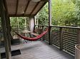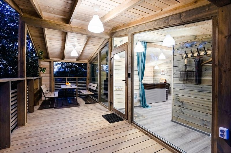 Терраса площадью 12м2 оборудована деревянным столом и скамейками со спинкой, гамаком, розетками и освещением по периметру и зонам. С террасы открывается панорамный вид на кроны молодых осин.