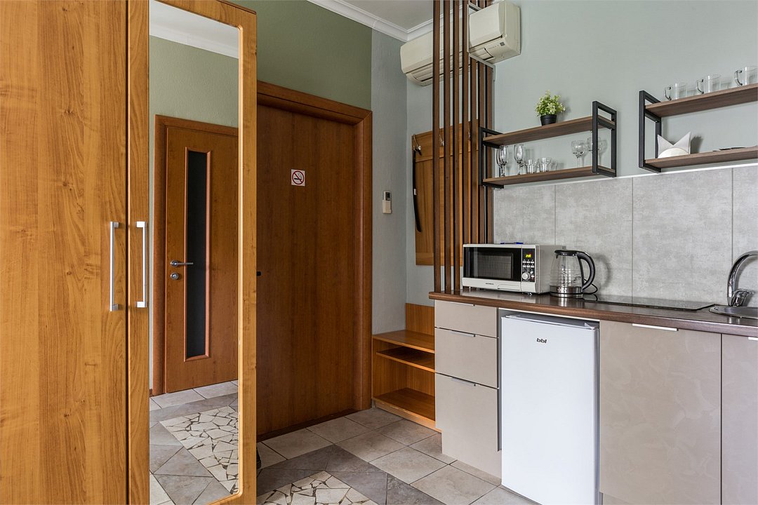 Комфортабельная студия 24 кв.м. для проживания 3 человек в самом центре Санкт-Петербурга с окнами на тихую улицу. Студия оснащена современной мебелью и техникой для полноценного комфортного краткосрочного и длительного проживания. В студии гармонично расположена спальная зона с двуспальной кроватью и ортопедическим матрасом и кресло-кровать для 1 человека, кухня и свой сан.узел. Кухня оснащена посудой, чайником, электрической плитой, холодильником. Мы предоставляем для Вас свежее постельное белье, полотенца, косметические принадлежности в день заселения, средства для чистки одежды, губки и сушильные приборы для обуви. Самое главное – студия оснащена электронным замком, что позволяет организовать для Вас бесконтактное заселение. За один день до заезда Вы получите код для замка, которым сможете пользоваться в течение всего проживания. Так же, в целях безопасности, общие зоны оборудованы видеокамерами. Апартаменты расположены на 3 и 4 этажах.Услуги и удобства