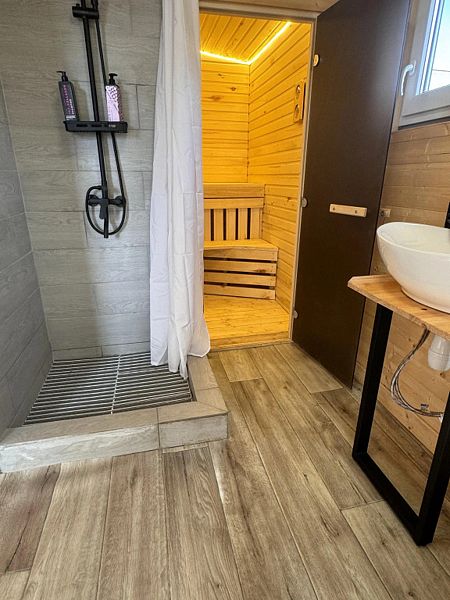 На территории есть баня на дровах с холодной купелью. Баня — полноценный дом со всеми удобствами, мебелью, посудой и всем необходимым!