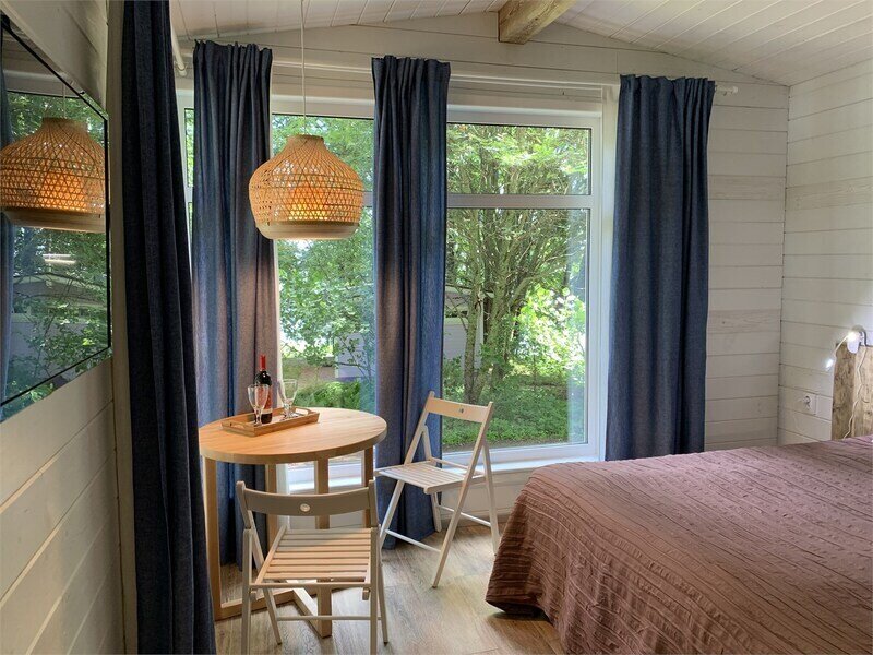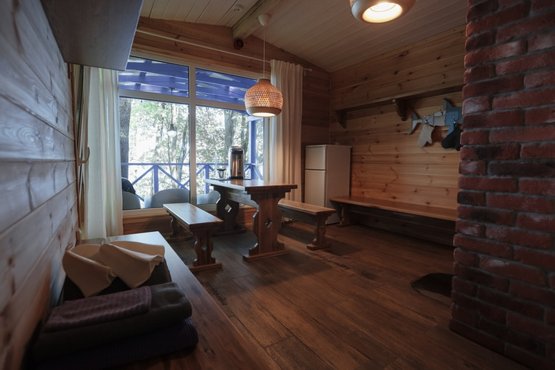Коттедж оборудован всем необходимым для комфортного размещения двух человек или семейной пары с ребёнком до 8 лет. Комфортная температура в доме поддерживается за счет пола с электроподогревом. Коттеджи имеют отдельно стоящую беседку с уличной мебелью. Возле каждого домика оборудована площадка с мангалом.