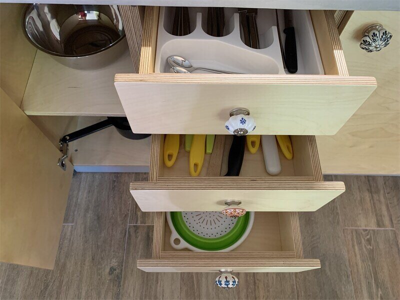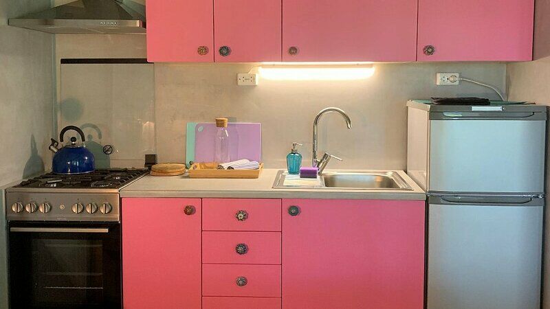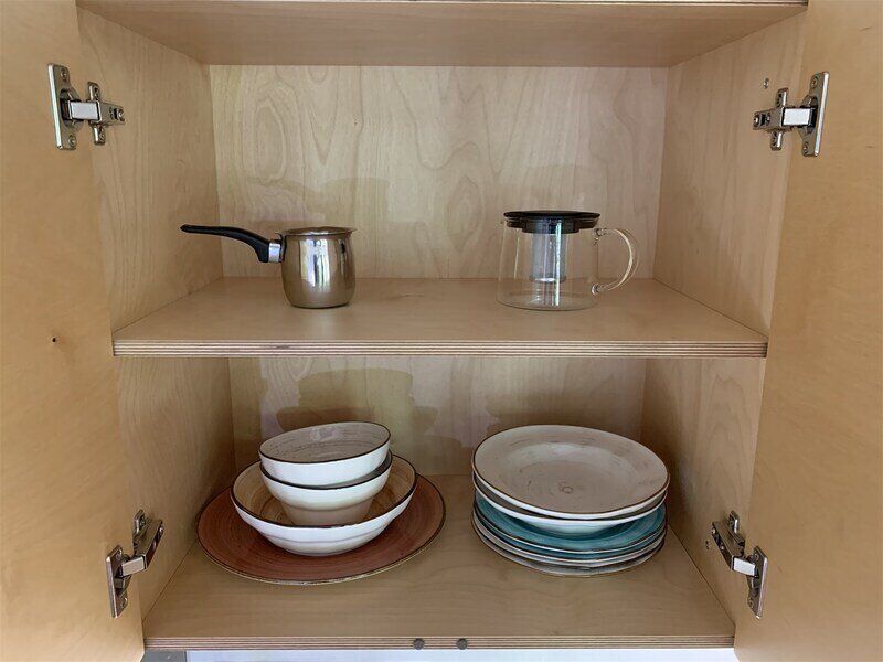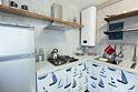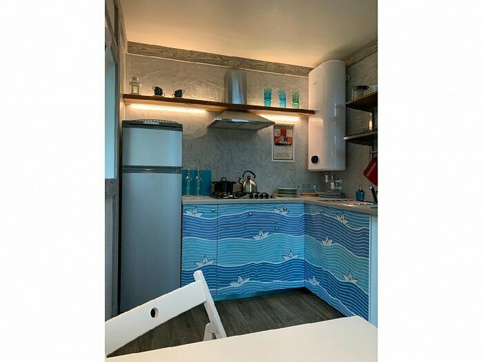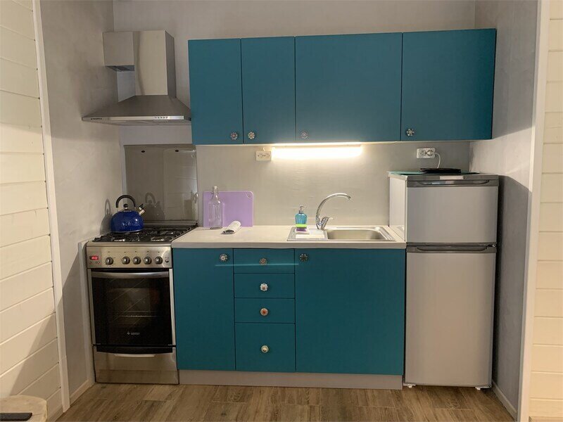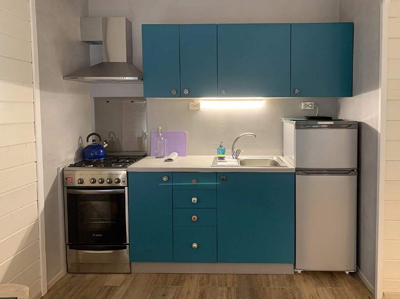 - кухонный уголок (разделочный стол, холодильник с морозильной камерой, газовая плита с духовкой, вытяжка, чайник, раковина, весь необходимый набор посуды для приготовления, посуда для сервировки стола)