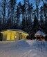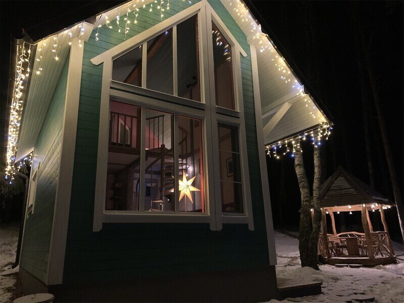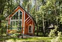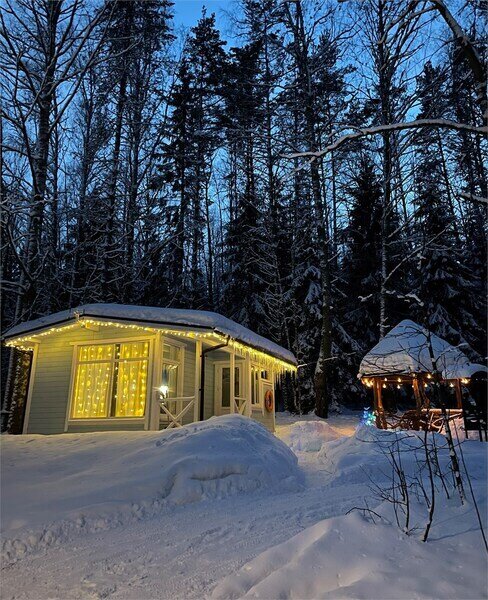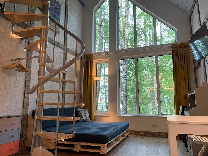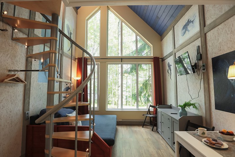 Коттедж оборудован всем необходимым для комфортного размещения четырех человек или семейной пары с двумя детьми. На втором этаже двуспальная кровать, на первом — двуспальный диван-кровать. Дополнительно можно установить кроватку-манеж. Комфортная температура поддерживается за счет пола с электроподогревом.