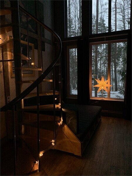 Коттедж оборудован всем необходимым для комфортного размещения компании из четырех человек или семейной пары с двумя детьми. На втором этаже двуспальная кровать, на первом — двуспальный диван-кровать. Дополнительно можно установить кроватку-манеж.