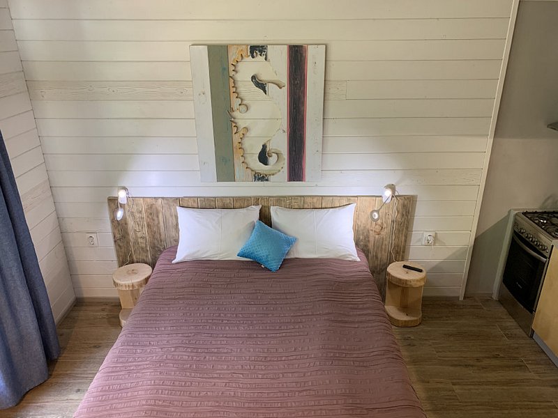 Коттедж оборудован всем необходимым для комфортного размещения двух человек или семейной пары с ребёнком до 8 лет. Комфортная температура в домике поддерживается за счёт пола с электроподогревом. Коттеджи первой линии имеют просторную террасу с уличной мебелью. Возле каждого домика оборудована площадка с мангалом.