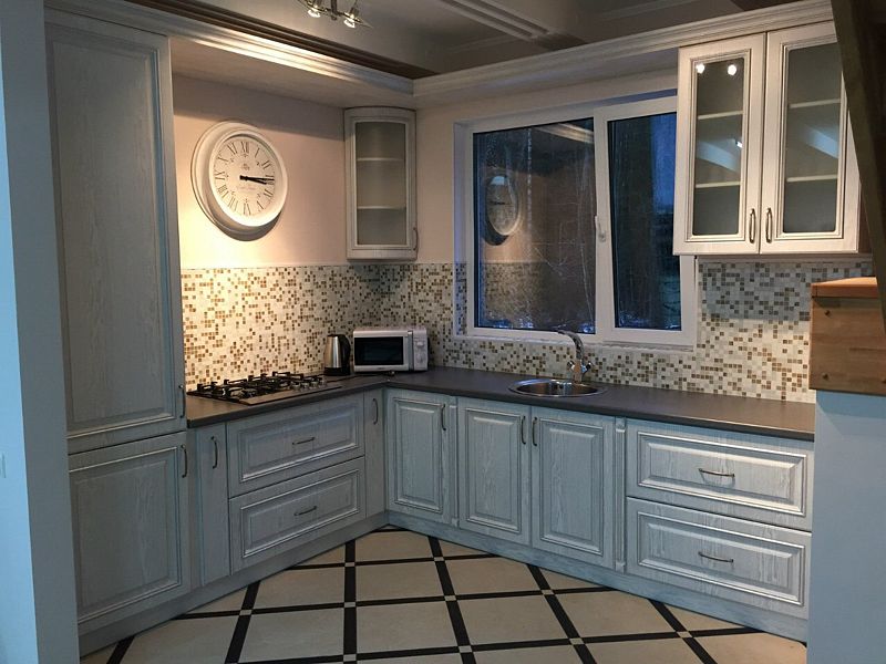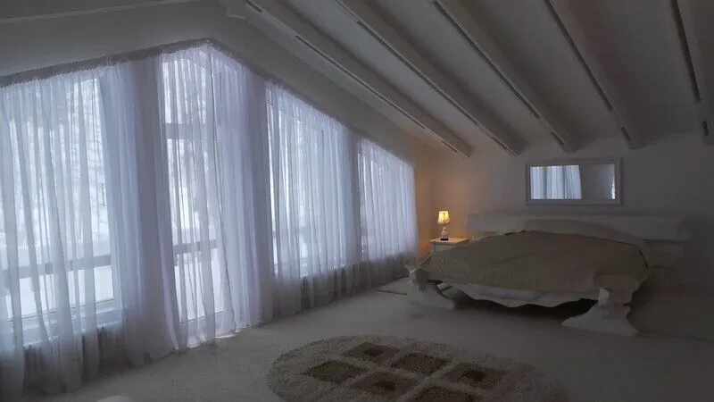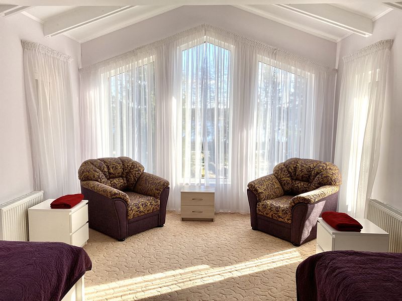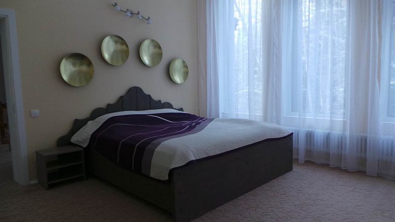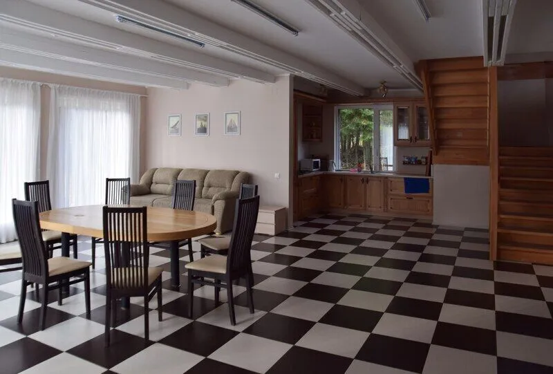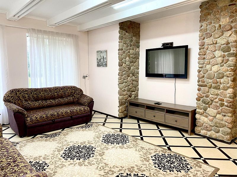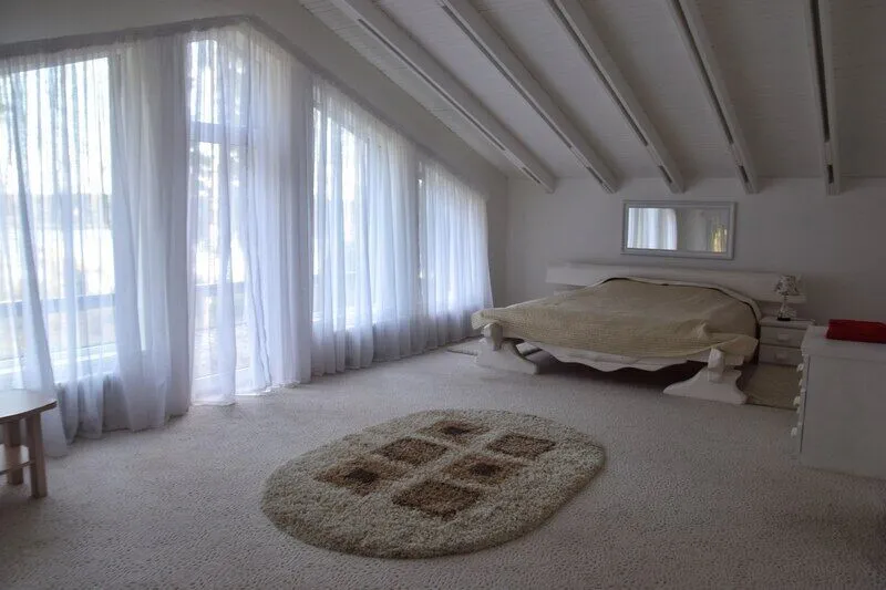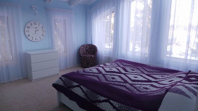 На первом этаже: прихожая, гостиная-столовая, кухня, комната отдыха, русская баня, туалет, душ. Везде теплый пол. На кухне: газовая плита, холодильник, чайник, микроволновка, раковина-мойка посуда, столовые приборы. В гостиной стоит обеденный стол и 10 стульев. На втором этаже: 5 спален, туалет, душ. 4 спальни: кровать "king-size". 1 спальня: 2 односпальные кровати.