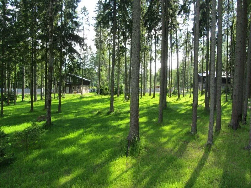 Коттеджи находятся на удалении друг от друга в окружении елового леса.