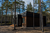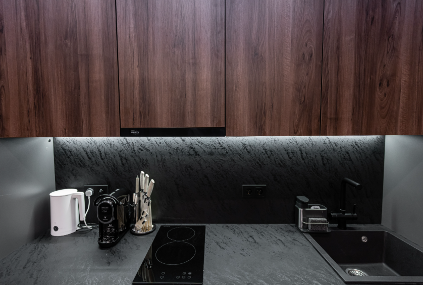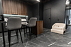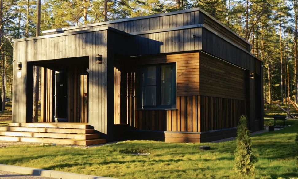 Дом сохранил всю функциональность оригинала: одну просторную спальню, комфортную кухню-гостиную и панорамные окна на лес, но получил совершенно иной характер. Фасад выполнен в графитово-чёрном оттенке, а в интерьерах преобладают древесные текстуры в сочетании с матовыми тёмными поверхностями и латунным декором.