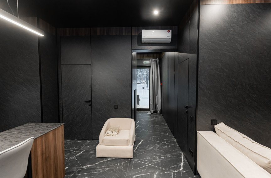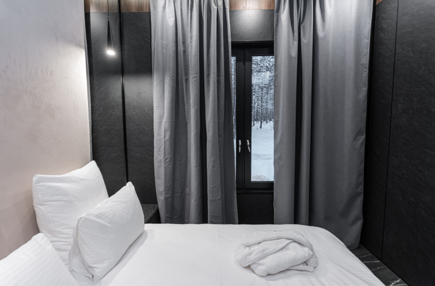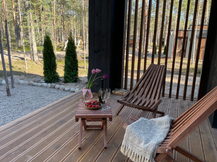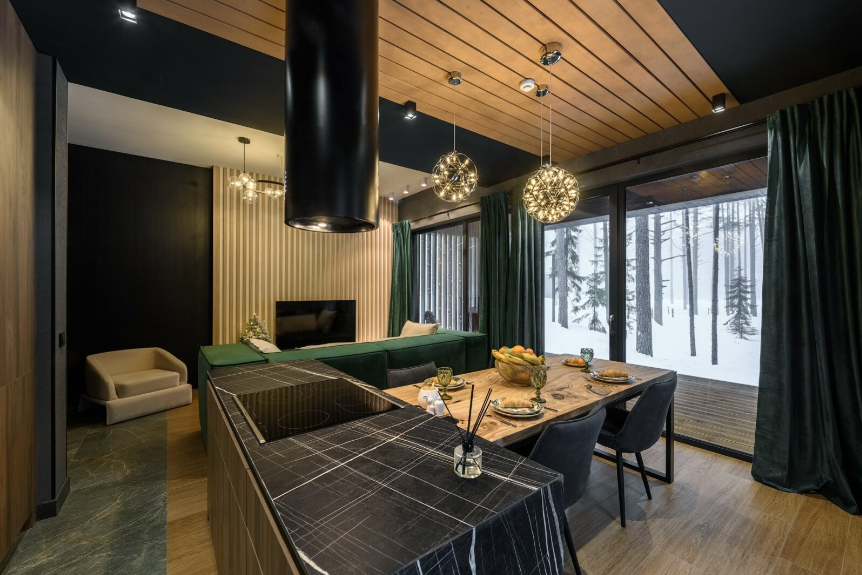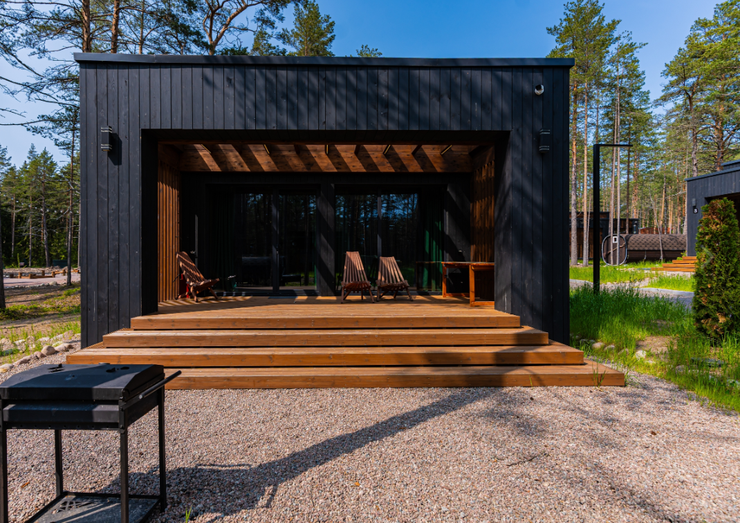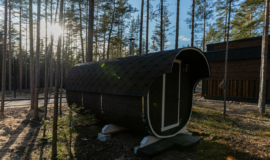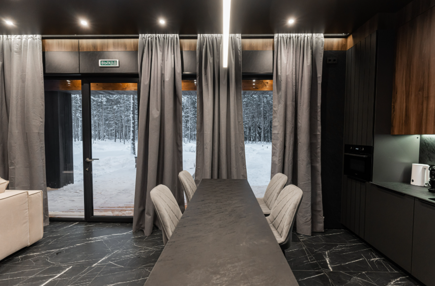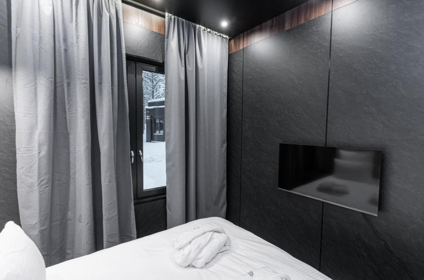 Контрастные акценты подчёркивают уют: мягкий тёплый свет, приглушённая подсветка у изголовья кровати, шерстяные пледы и фактурные шторы blackout. Чёрная Ривьера идеально подойдёт тем, кто ищет атмосферу сканди-лофта посреди соснового леса и хочет провести романтический уикенд или камерный мини-праздник в необычном пространстве.