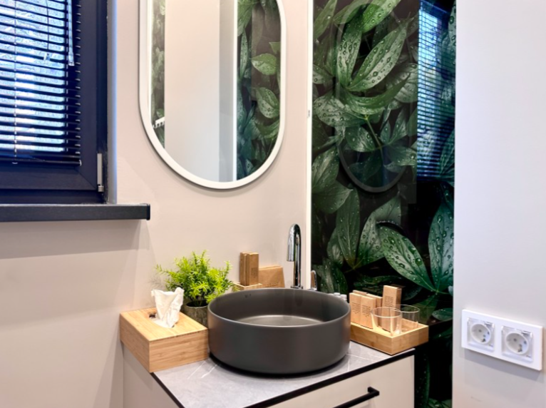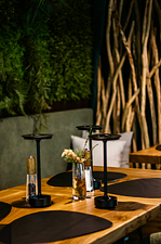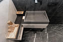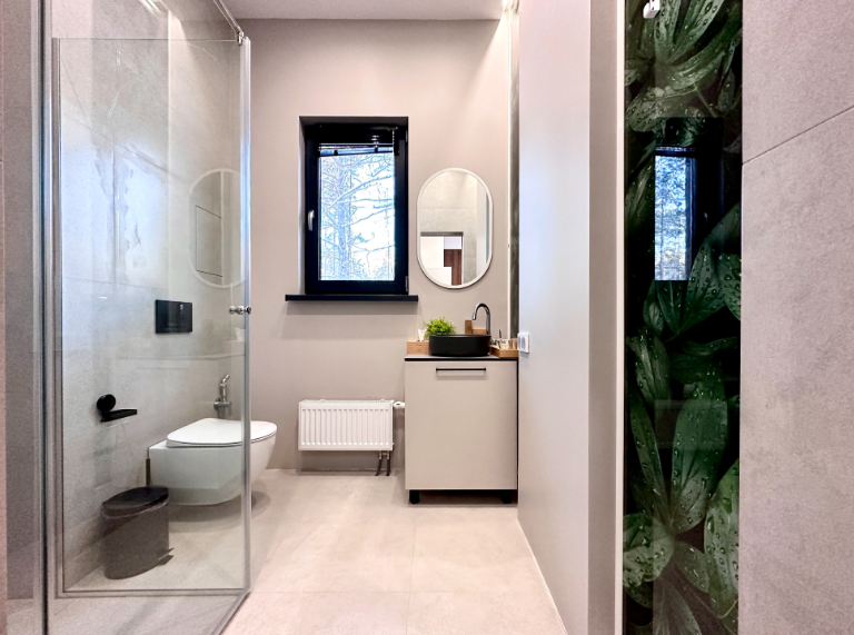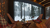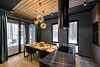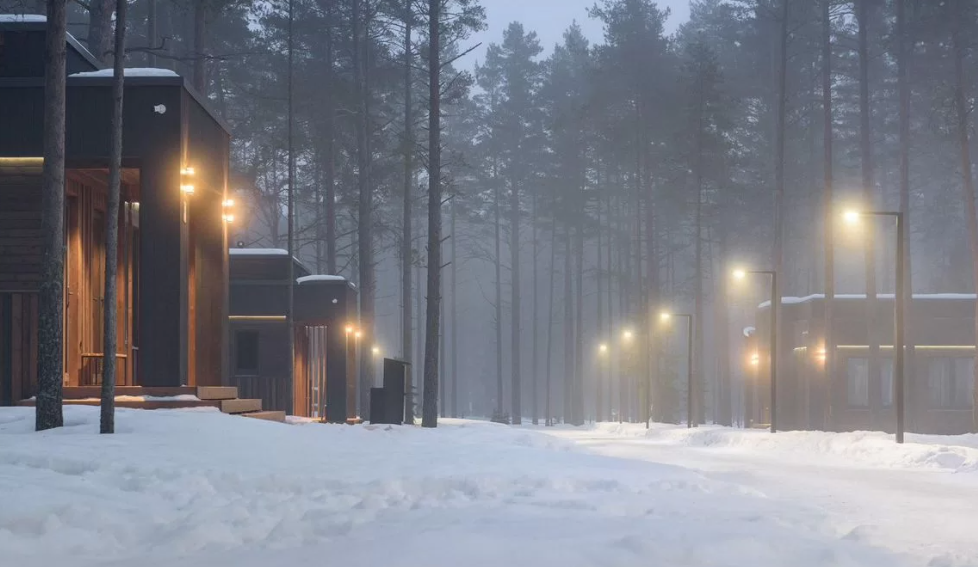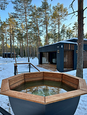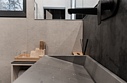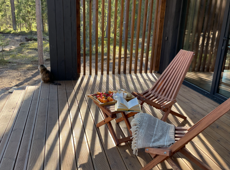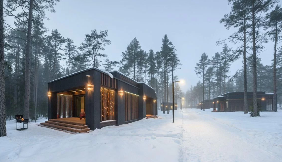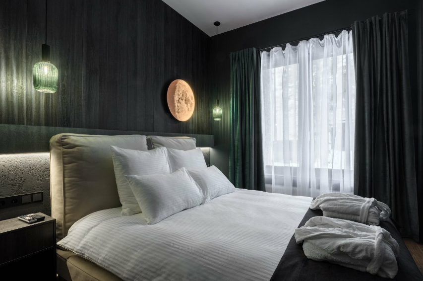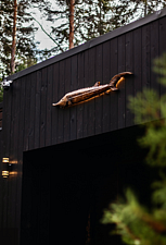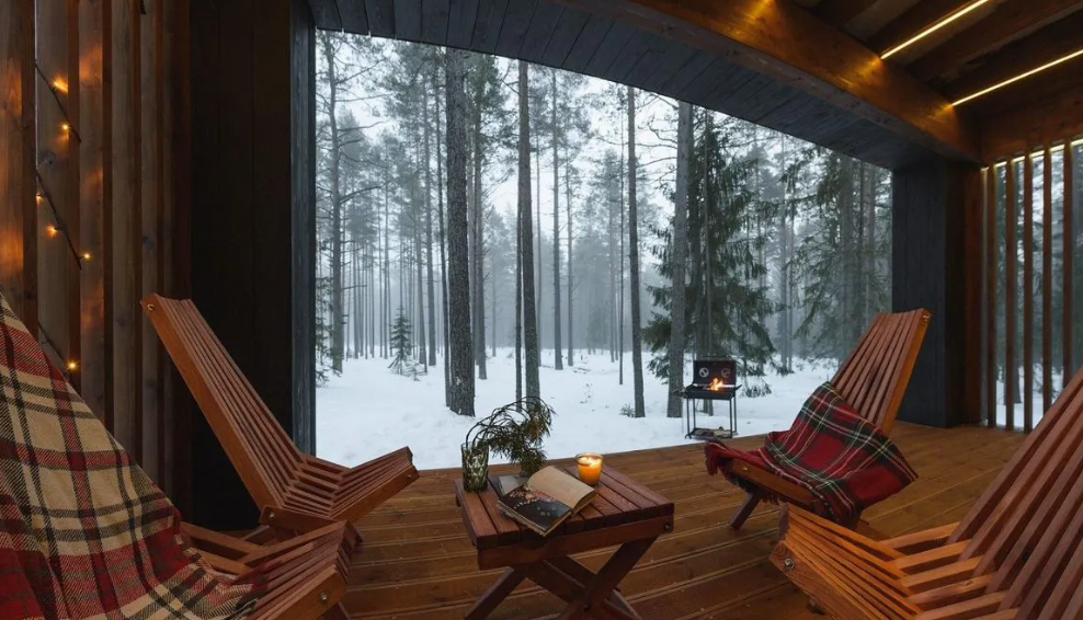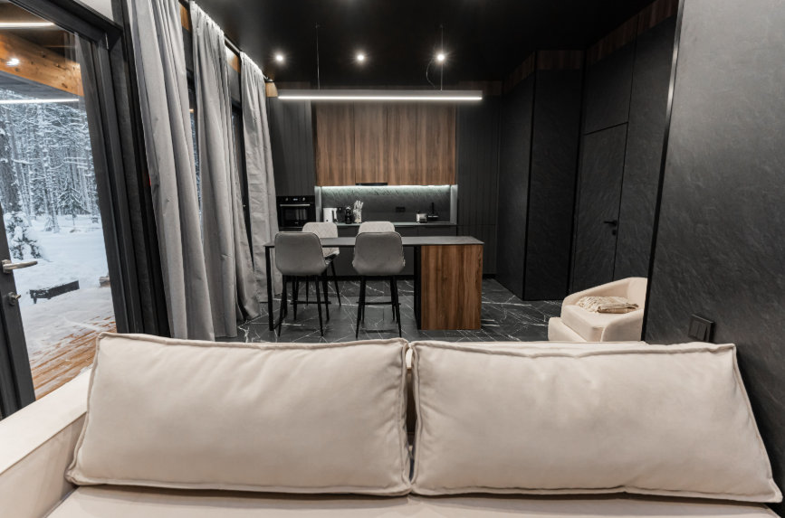 Контрастные акценты подчёркивают уют: мягкий тёплый свет, приглушённая подсветка у изголовья кровати, шерстяные пледы и фактурные шторы blackout. Чёрная Ривьера идеально подойдёт тем, кто ищет атмосферу сканди-лофта посреди соснового леса и хочет провести романтический уикенд или камерный мини-праздник в необычном пространстве.