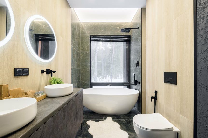 Комфортная ванна с панорамным окном на лес. Для удобства гостей предоставляются: халаты и полотенца, полный набор косметики, зубные наборы, шапочки для душа, мочалки, гребень, фен с несколькими видами насадок. По запросу предоставляются бомбочки и соль для ванны.