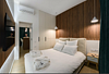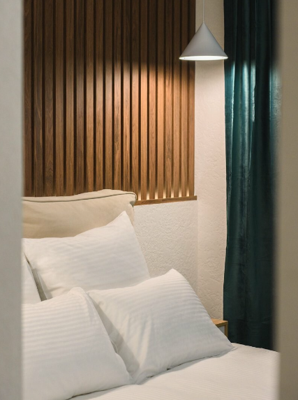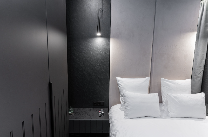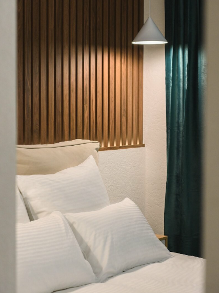 Вилла оснащена одной спальней, в которой предусмотрено все, чтобы сделать сон приятным: ортопедические матрасы, премиальное постельное белье, идеальная шумоизоляция, блэкаут шторы, приглушенная подсветка.