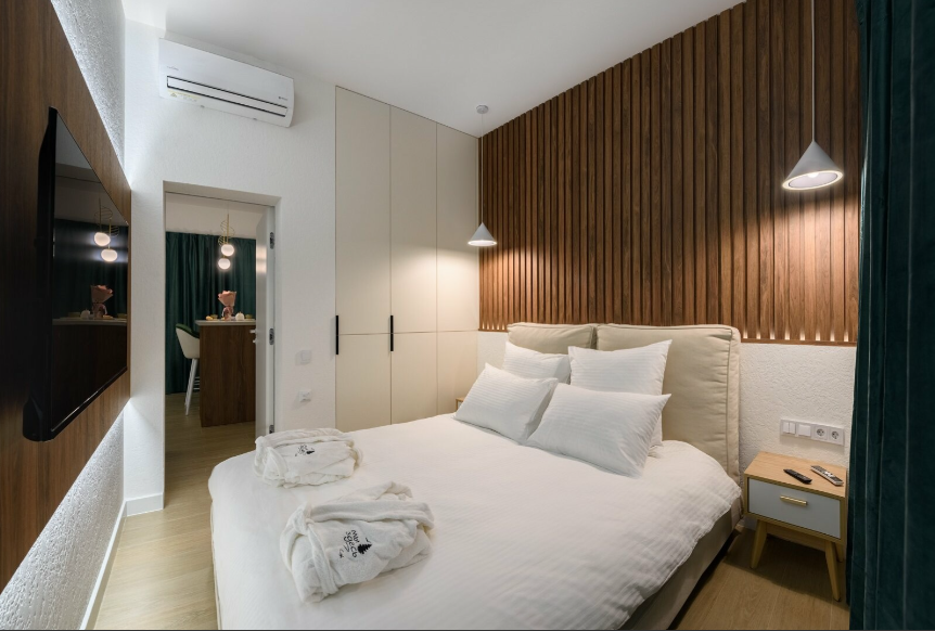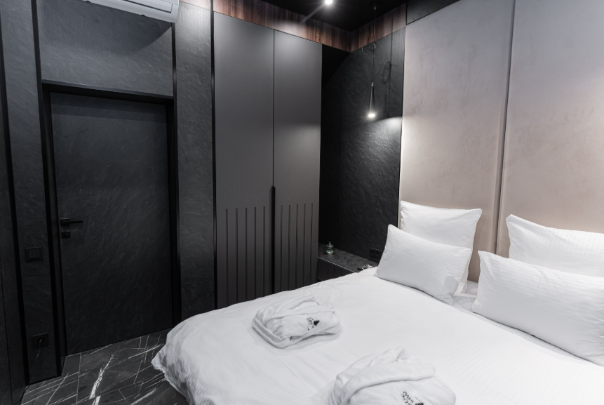 Вилла оснащена двумя спальнями. В каждой из них предусмотрено все, чтобы сделать сон приятным: ортопедические матрасы, премиальное постельное белье, идеальная шумоизоляция, блэкаут шторы, приглушенная подсветка.