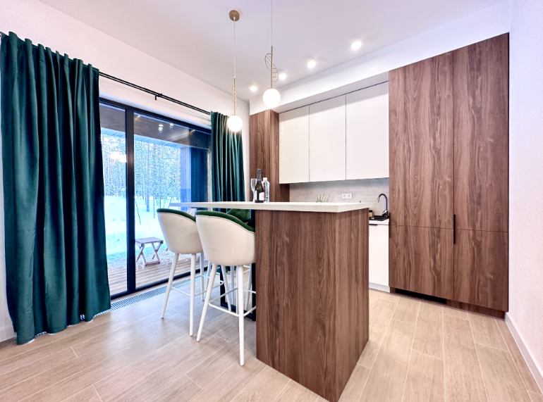 Для гостей доступны пять вилл, отличающихся продуманным дизайном и оснащением. Компактные, но функциональные и современные, они предлагают все для комфортного пребывания. Просторные гостиные, прекрасно оборудованные кухни, отдельные спальни и уютные уголки для отдыха создают домашнюю атмосферу. Панорамные окна обеспечивают завораживающие виды на лес и залив, а собственная терраса у каждой виллы — идеальное место для приватного досуга.