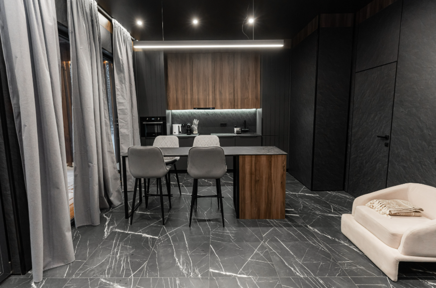 Просторная кухня — гостиная станет идеальным местом для совместных посиделок, приготовления еды и шумных застолий.