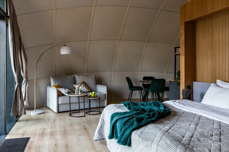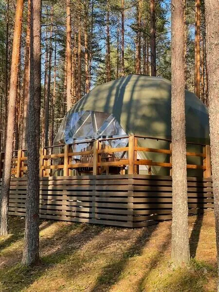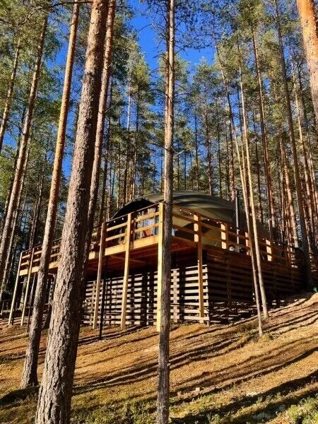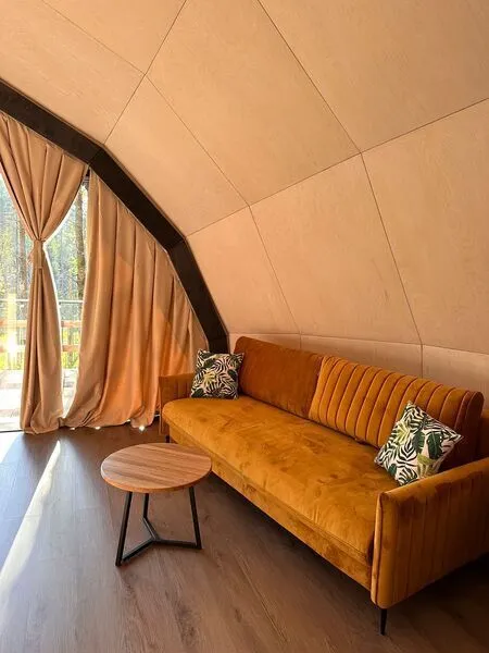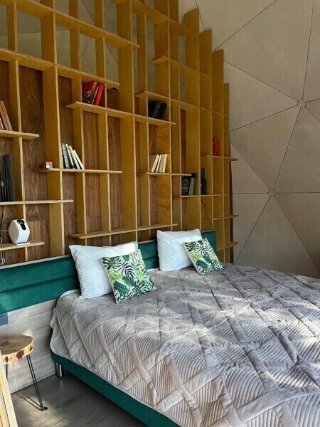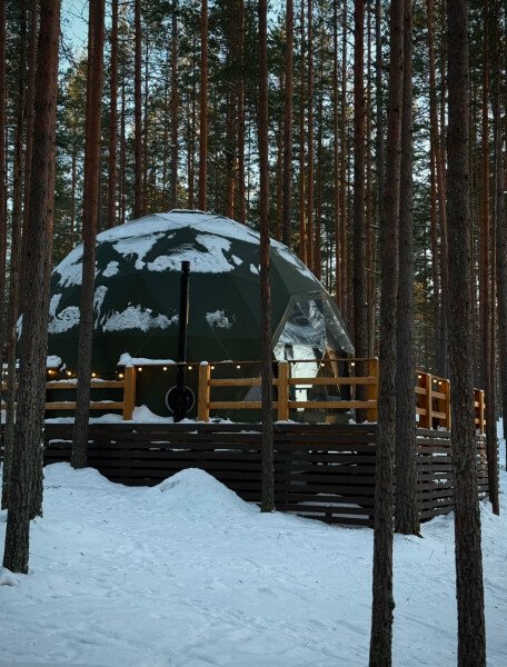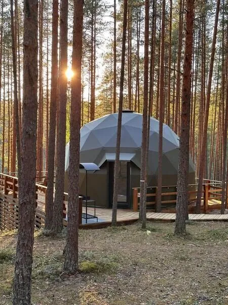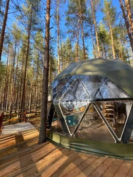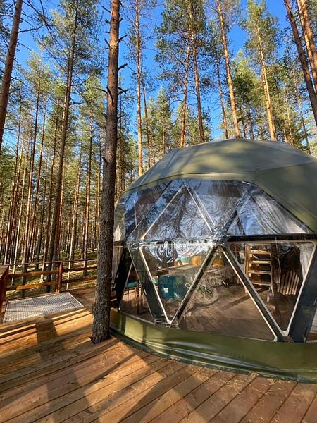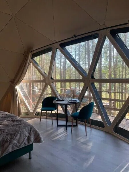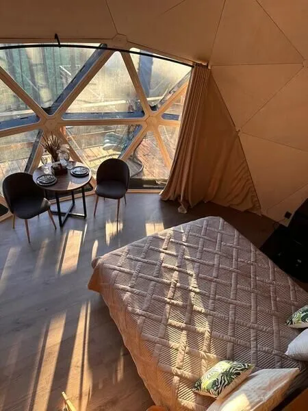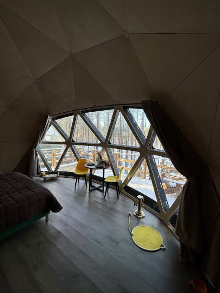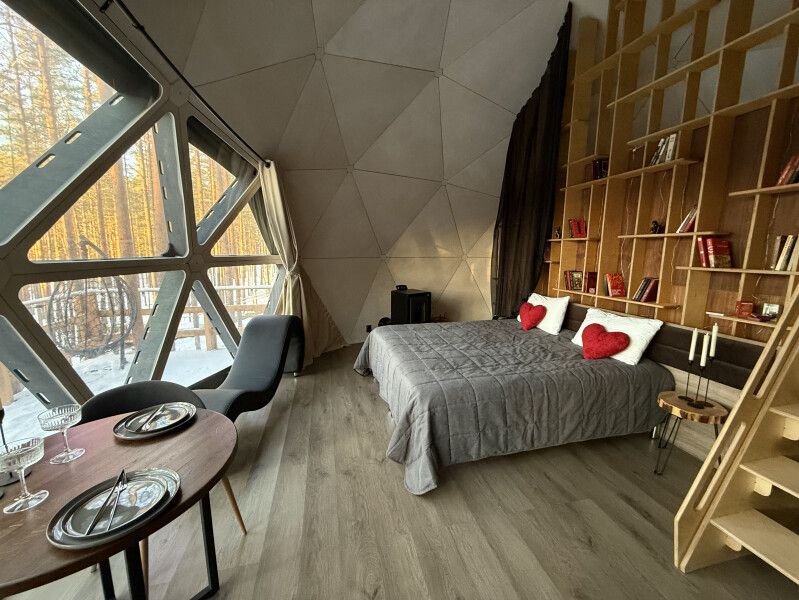 Уют и комфорт: Невероятная полусферическая конструкция, уютная деревянная отделка, наполняющая пространство ароматом леса, и панорамное окно, открывающее захватывающий вид на сказочный лес и таинственное озеро. Просторная кровать обеспечит вам крепкий и спокойный сон. Стильный дизайн и продуманная планировка подарят ощущение умиротворения и комфорта.