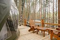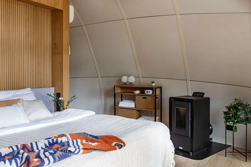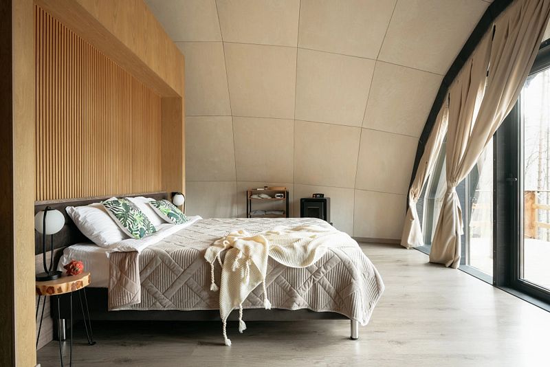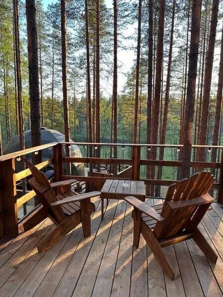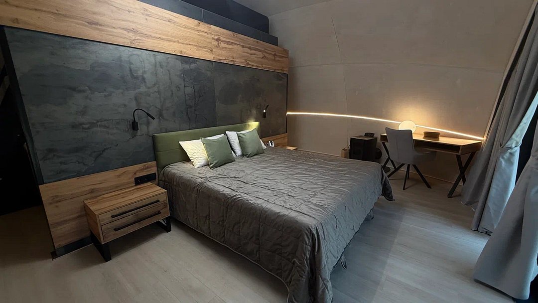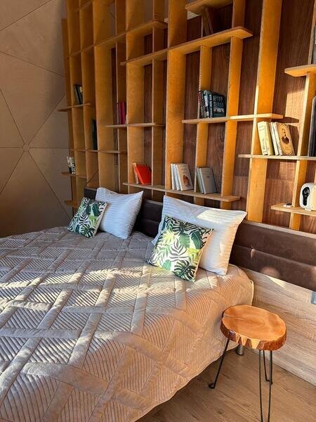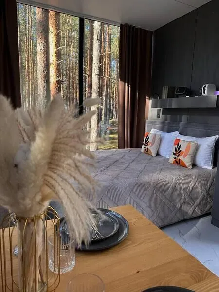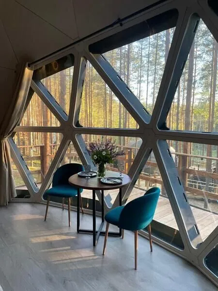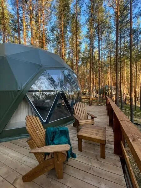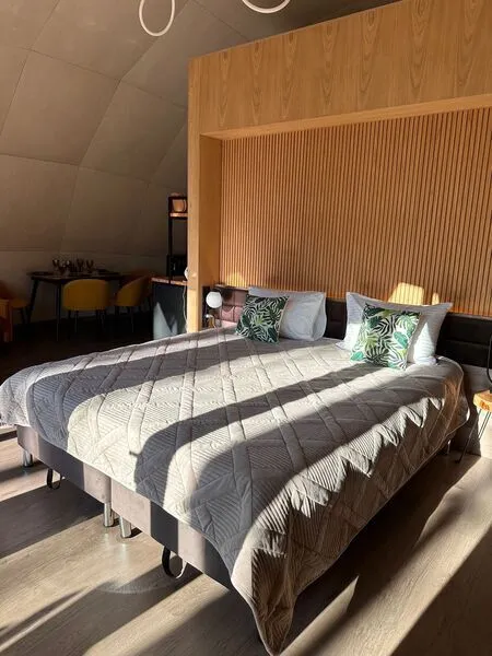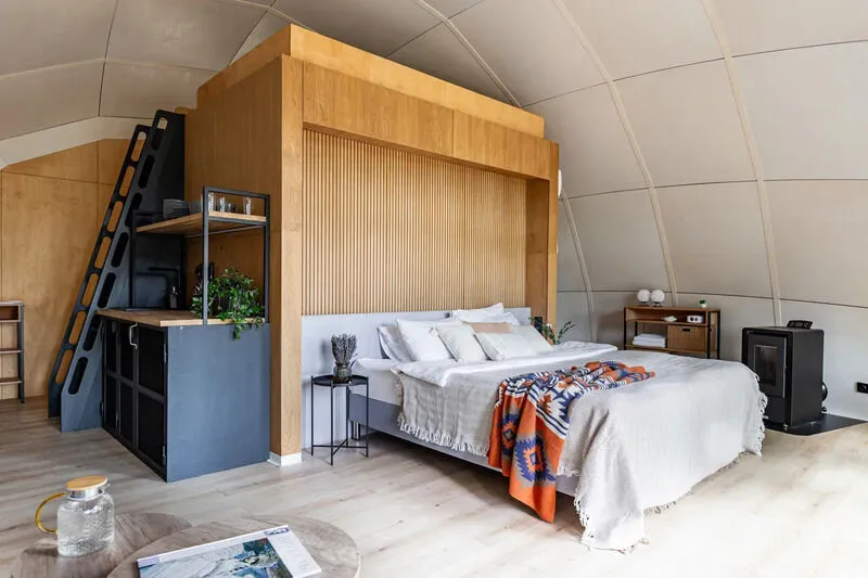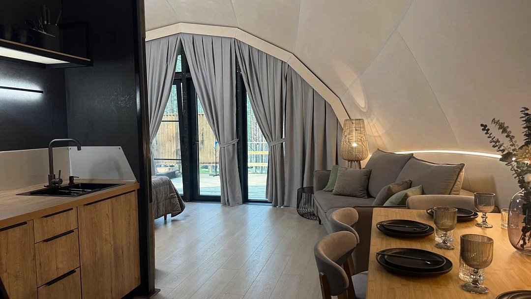 Уют и комфорт: Невероятная полусферическая конструкция, уютная деревянная отделка, наполняющая пространство ароматом леса, и панорамное окно, открывающее захватывающий вид на сказочный лес и таинственное озеро. Просторная кровать обеспечит вам крепкий и спокойный сон. Стильный дизайн и продуманная планировка подарят ощущение умиротворения и комфорта.