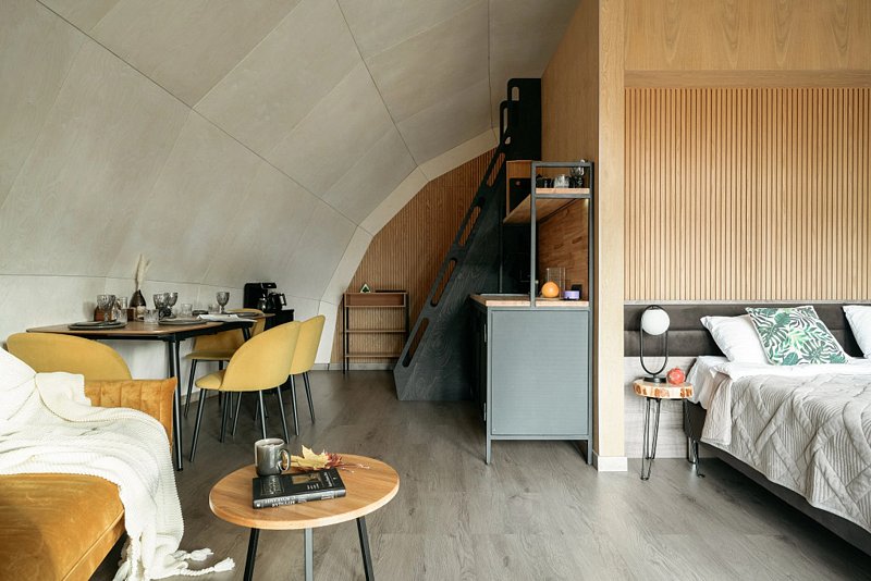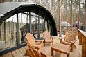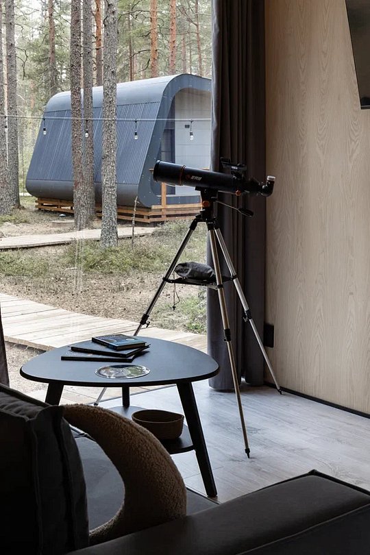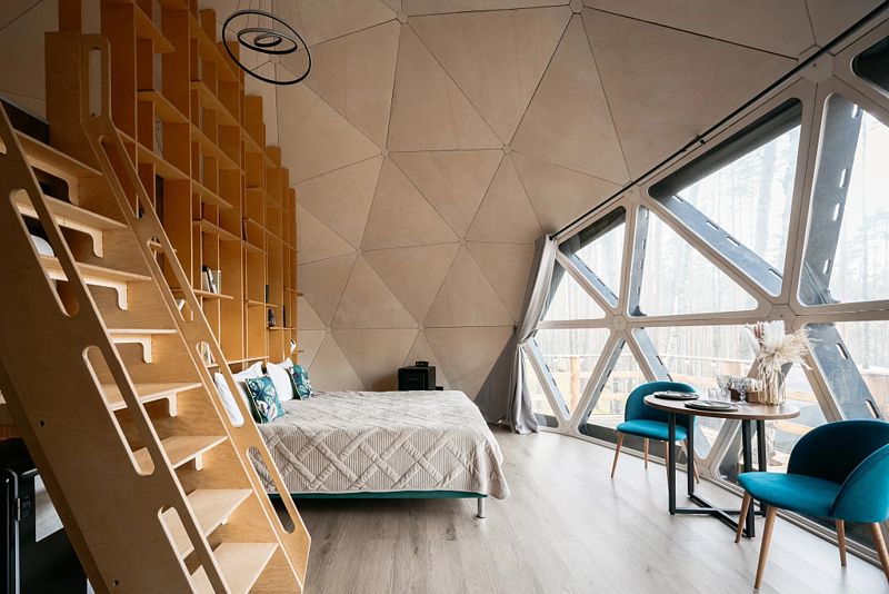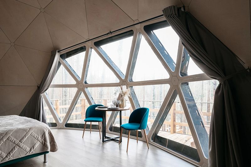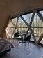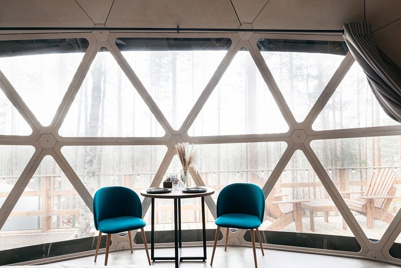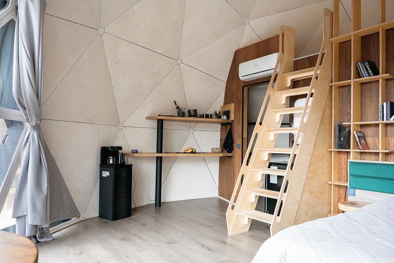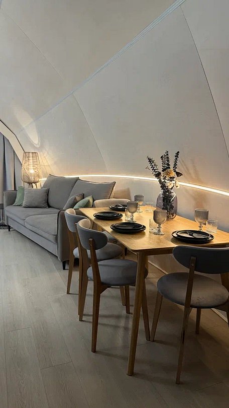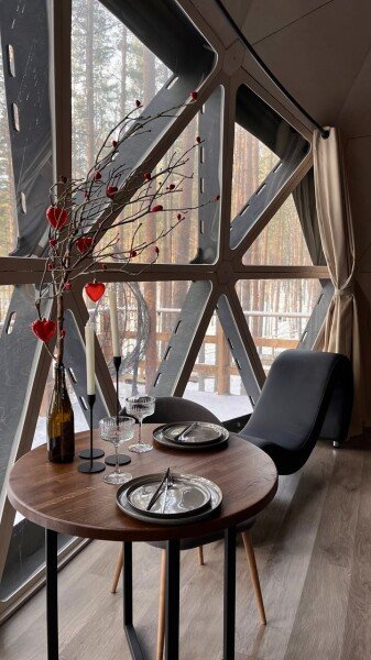В каждой сфере есть атмосферный пеллетный камин, кондиционер, мягкие стулья у обеденного столика, два дополнительных спальных места на импровизированном втором этаже (мезанине).