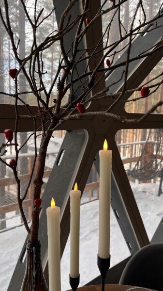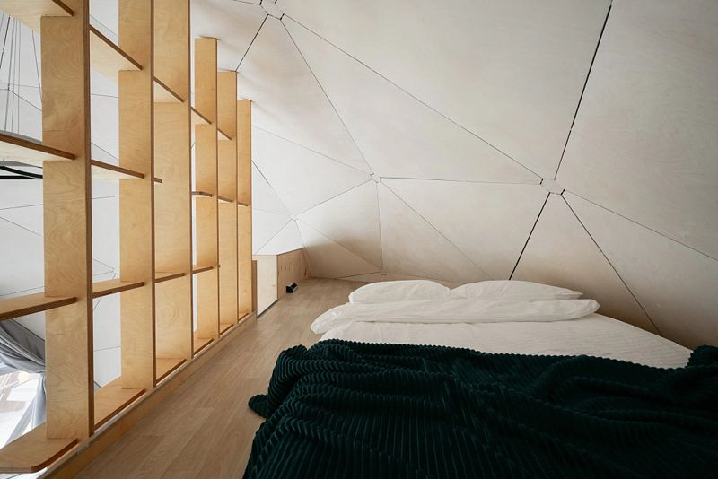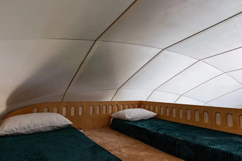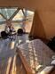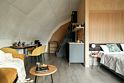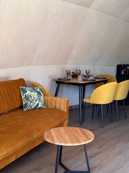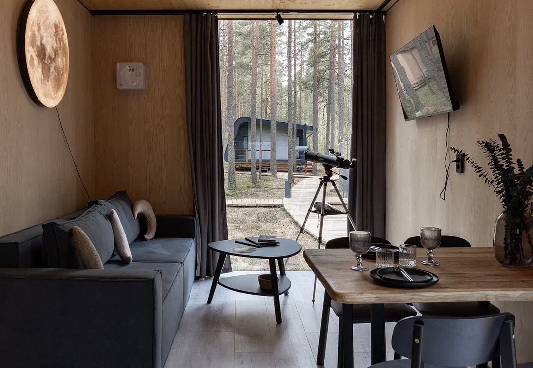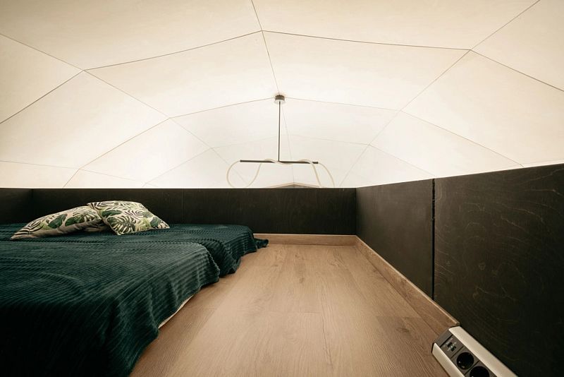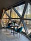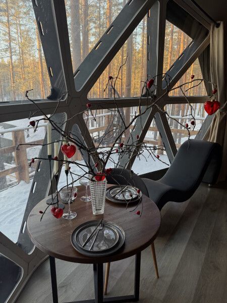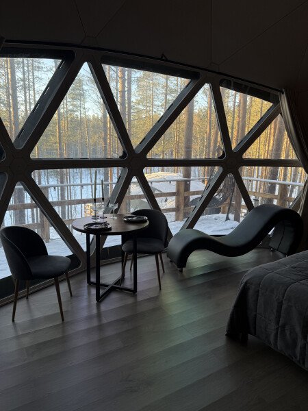 В каждой сфере есть атмосферный пеллетный камин, кондиционер, мягкие стулья у обеденного столика, два дополнительных спальных места на импровизированном втором этаже (мезанине).