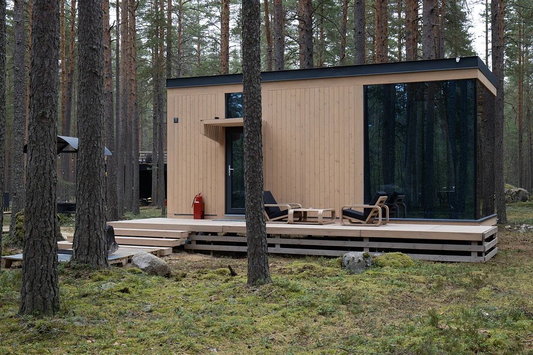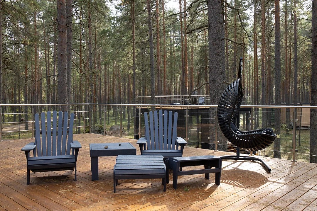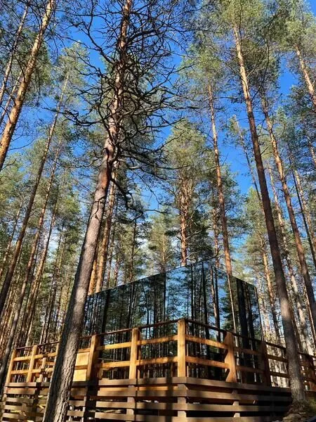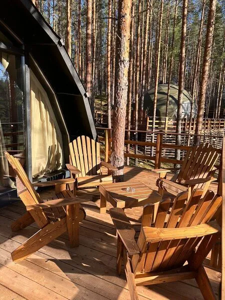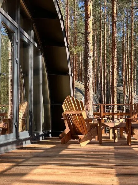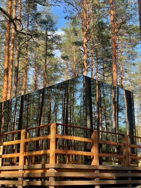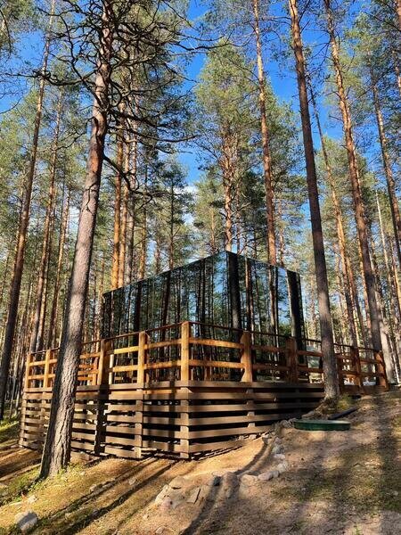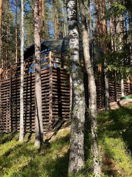 Семейный отдыхДостоинстваРасположение домиков великолепно спланировано для обеспечения уединения гостей, каждый из них находится в своем уголке, что создает атмосферу спокойствия и комфорта. Зеркальный домик в который мы заселились, очень необычный, но красивый и уютный, с отличным видом. Завтраки здесь просто потрясающие, порции огромные, так что никто не останется голодным. Мы успели попробовать как завтраки, так и основное меню, и остались в восторге. Каждый домик оборудован зоной для барбекю. На территории также есть небольшое озеро и баня, где можно отлично отдохнуть и расслабиться.