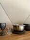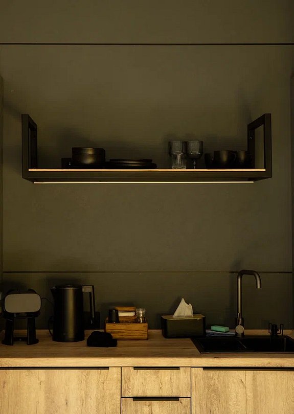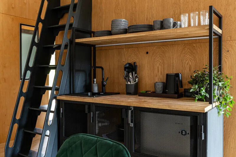 • Кухонная зона оснащена индукционной плиткой, раковиной, мини-холодильником и набором посуды для приготовления и сервировки блюд.