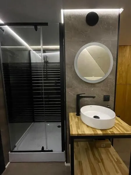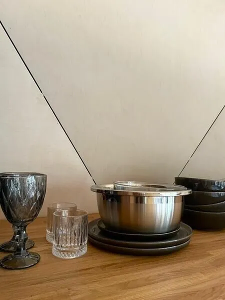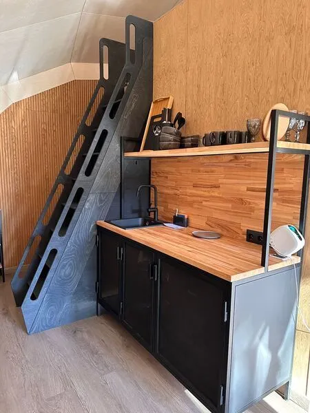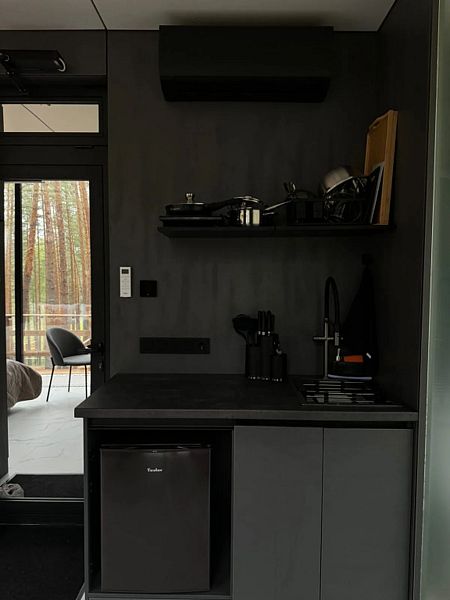 • Полноценная кухонная зона: Оснащена индукционной плиткой, раковиной, холодильником и набором посуды для приготовления и сервировки блюд