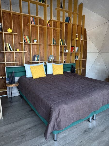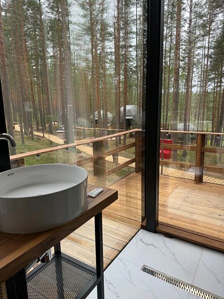 Невероятная конструкция дома в виде полусферы, уютная отделка стен деревом, которое позволяет дышать полной грудью. Панорамное окно с видом на сказочный лес и мистическое озеро. Стильный дизайн, удобная большая кровать для крепкого сна. Собственный санузел оснащен раковиной, душевой кабиной, феном.